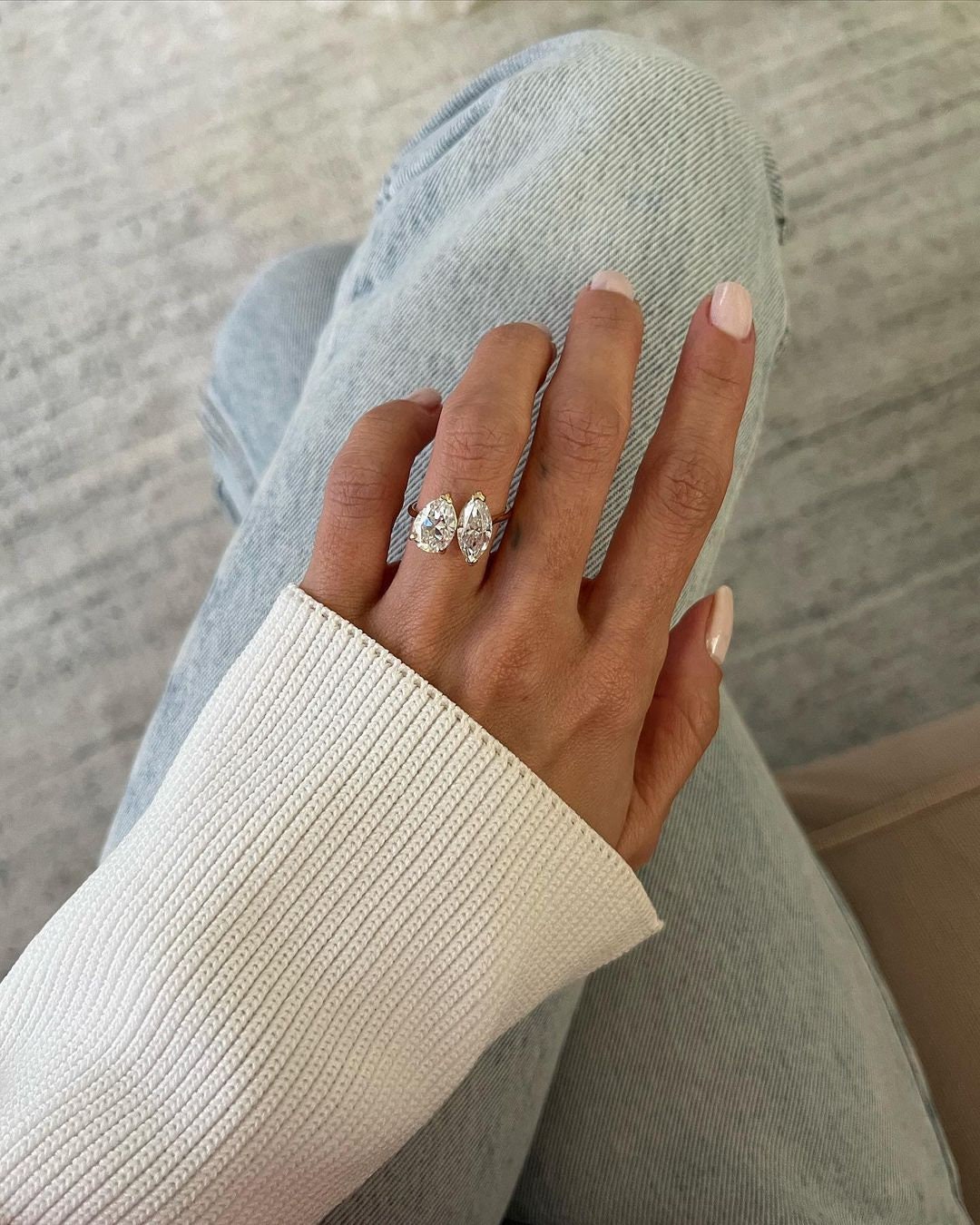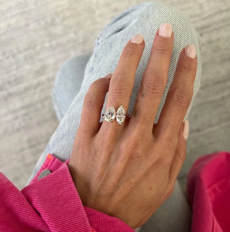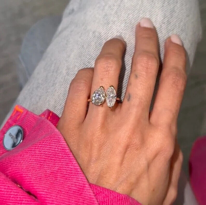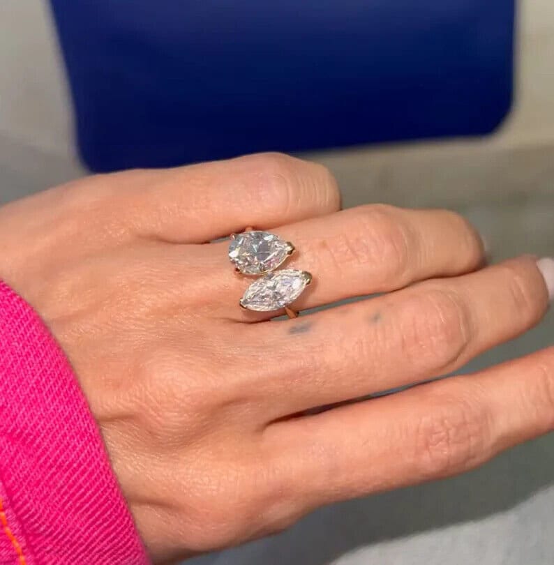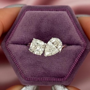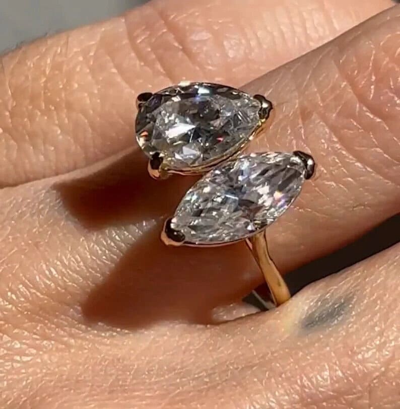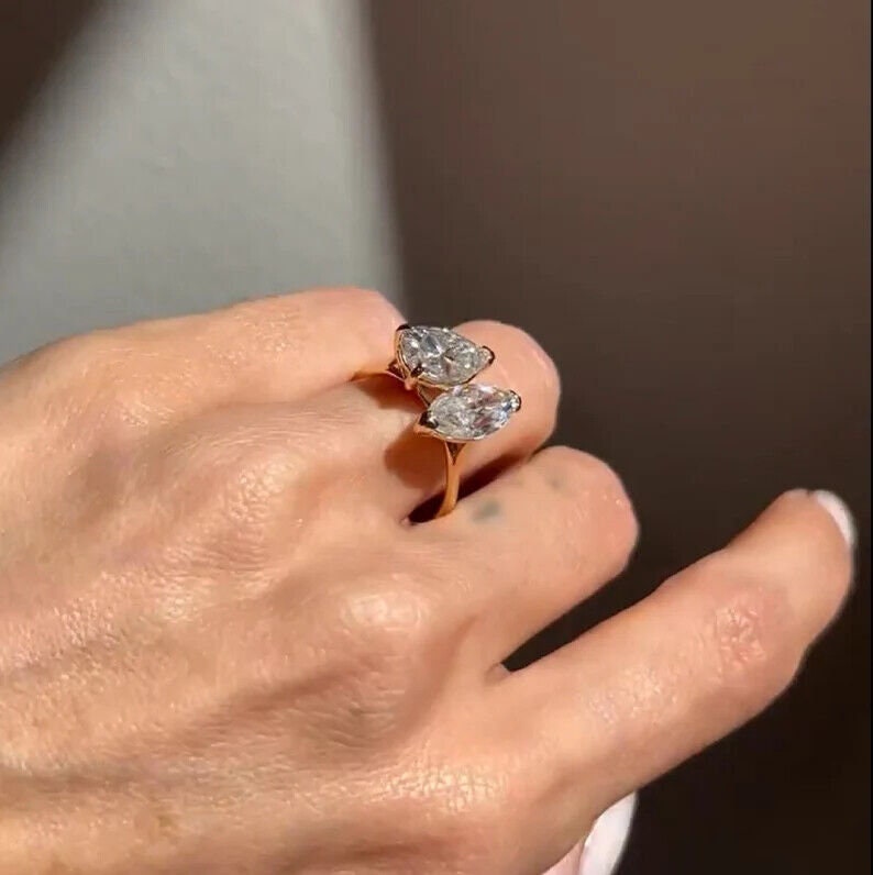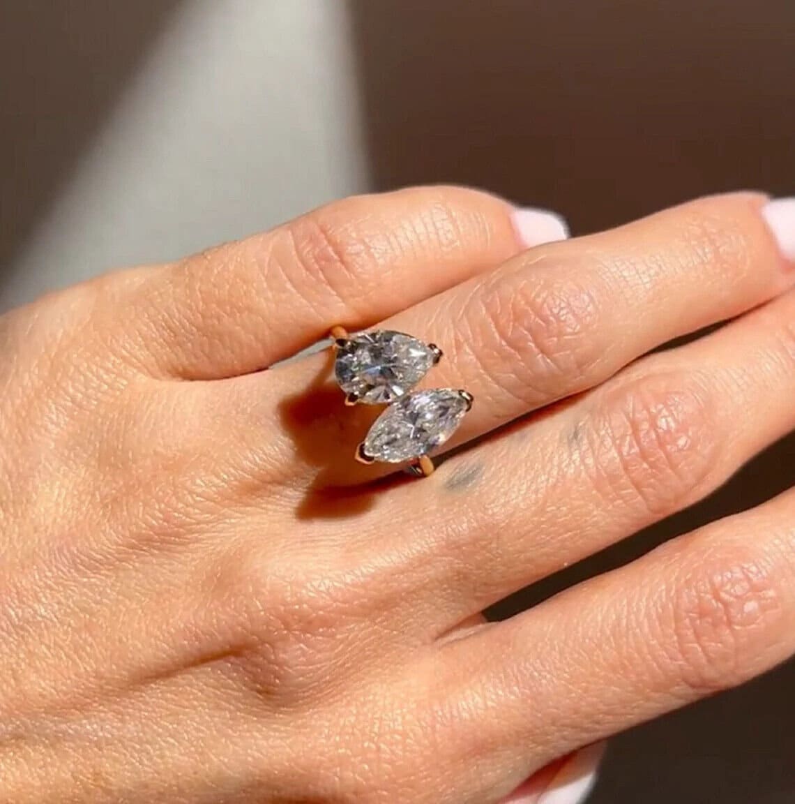 Toi et Moi Ring, Pear and Marquise Cut Moissanite Engagement Ring, Two Stone Diamond Ring in 14k Gold, Unique Bypass Wedding Ring for Her