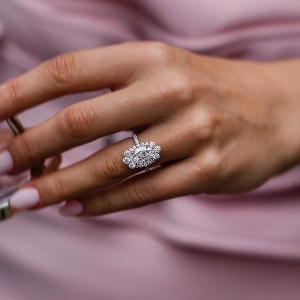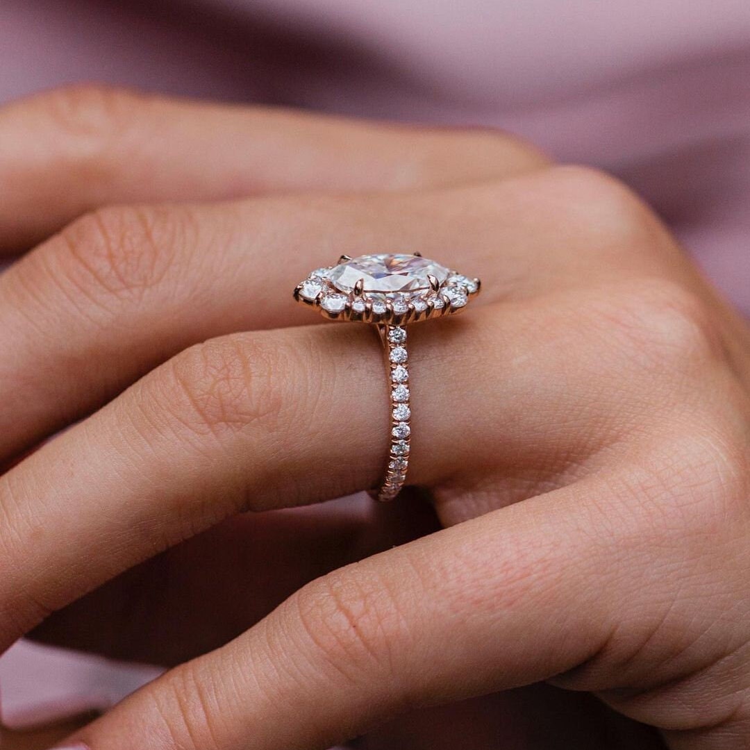 Art Deco Oval Engagement Ring Rose Gold, Vintage Floral Halo Moissanite Ring, Unique Halo Wedding Ring for Women, Diamond Promise Ring Gift