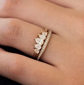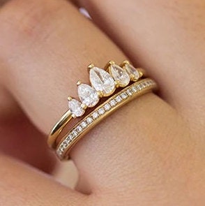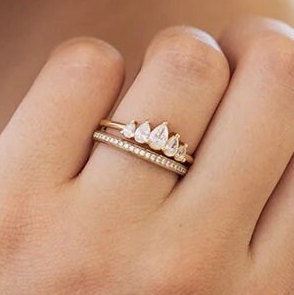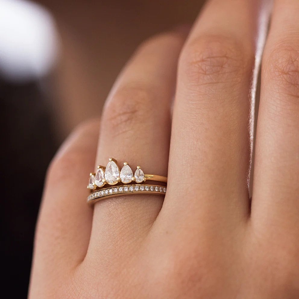 Pear Shaped Diamond Wedding Band, 14k Gold Crown Stacking Ring, Curved Moissanite Tiara Ring for Women, Teardrop Bridal Anniversary Gift