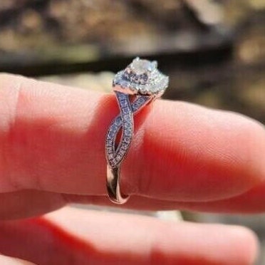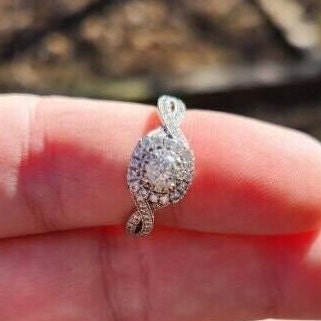 14K White Gold Double Halo Diamond Engagement Ring, Twisted Infinity Shank Promise Ring for Her, Round Cut Diamond Cluster Wedding Band
