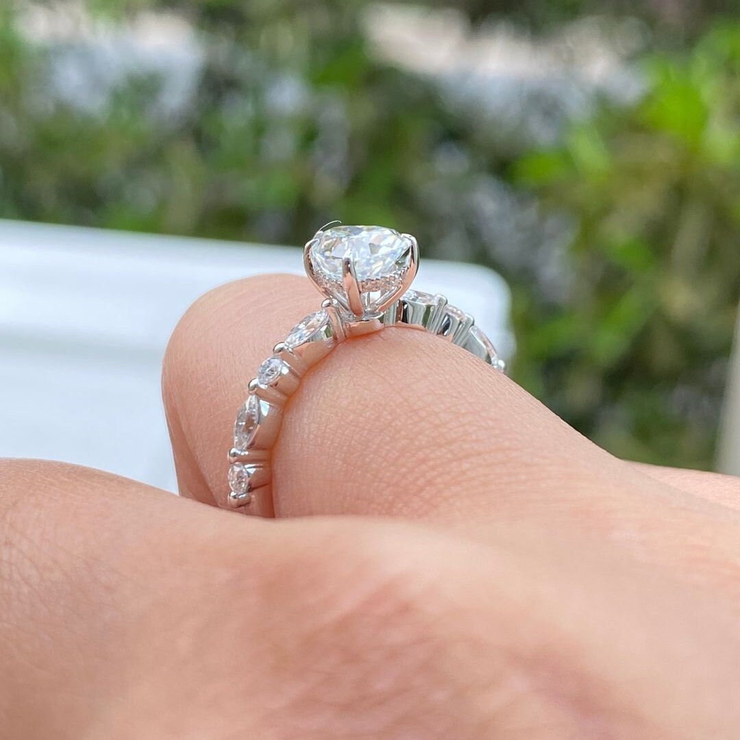 Pear Cut Moissanite Engagement Ring, 14K White Gold Pear Cut Ring, Marquise Diamond Cluster Band, Vintage Style Bridal Set, Anniversary Gift