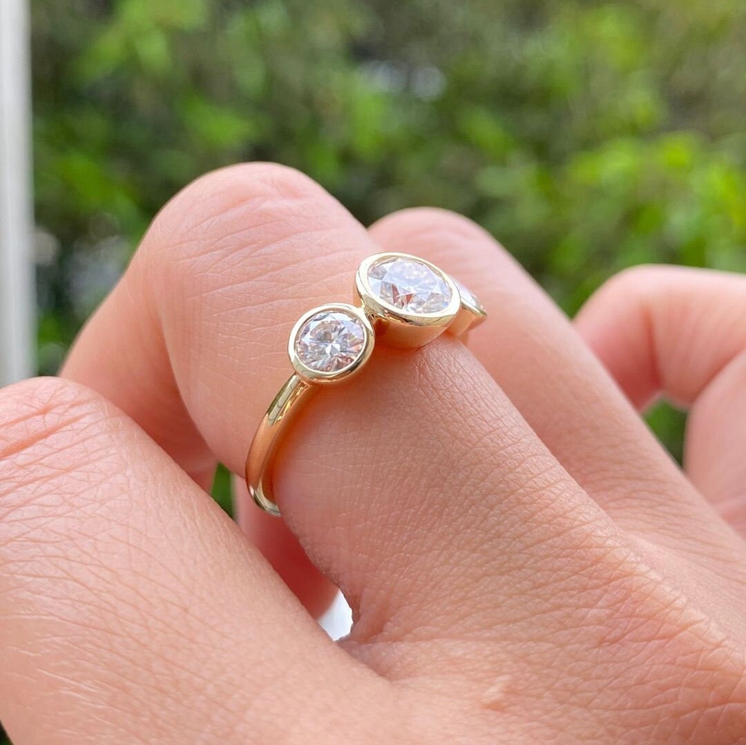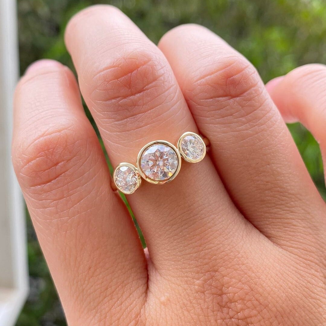 Three Stone Bezel Set Moissanite Engagement Ring in 14K Gold, Round Cut Trilogy Wedding Ring, Dainty Bezel Diamond Promise Ring for Women