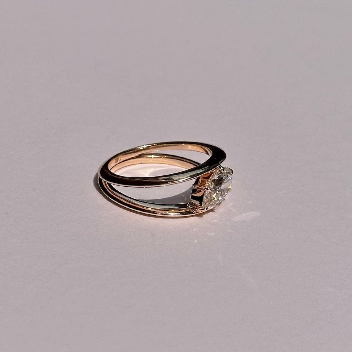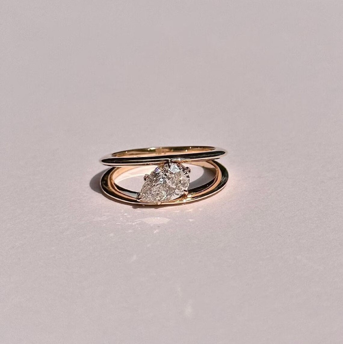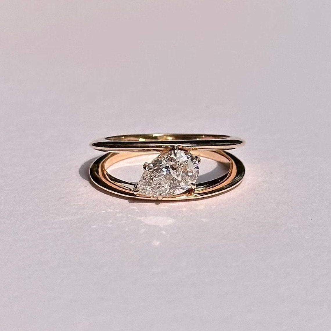 Pear Cut Moissanite Engagement Ring, Double Band Solitaire Ring, Minimal Yellow Gold Ring, Dainty Promise Ring, Unique Bridal Ring for Her