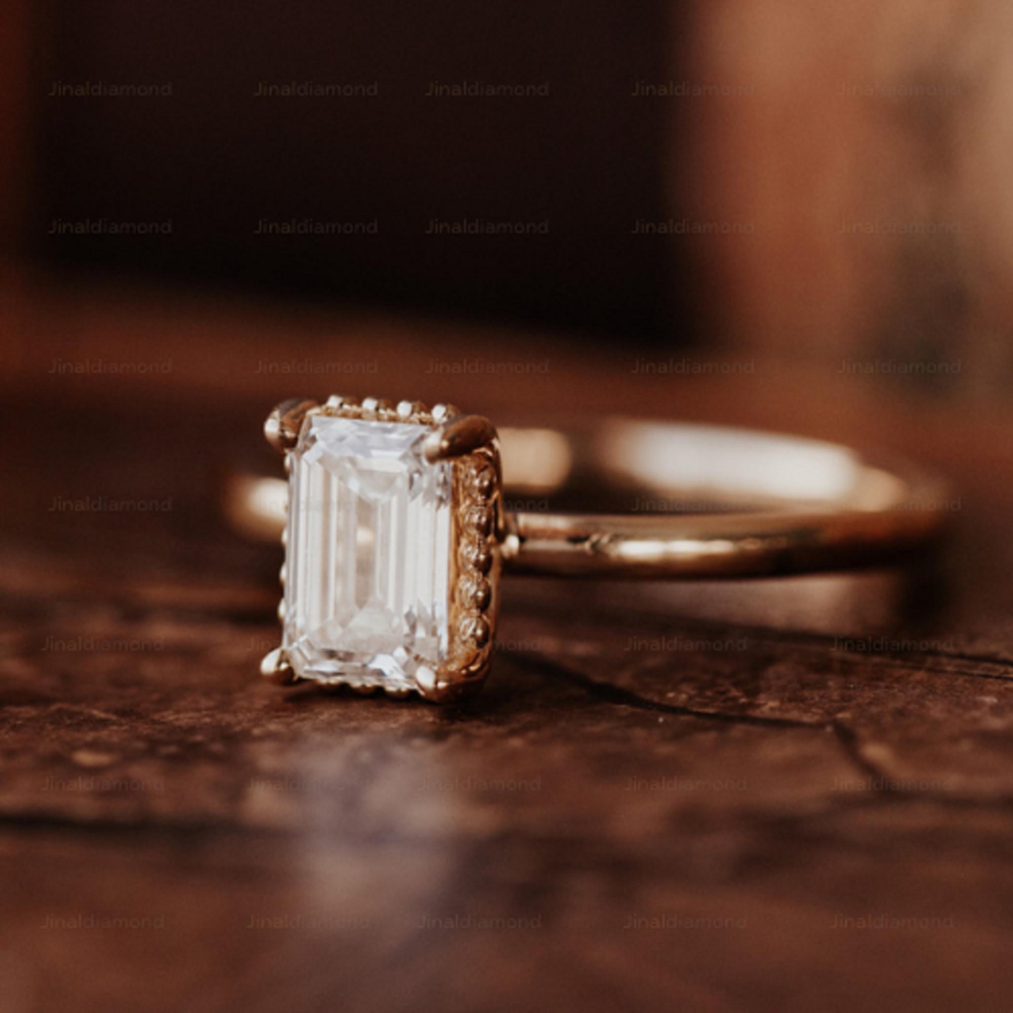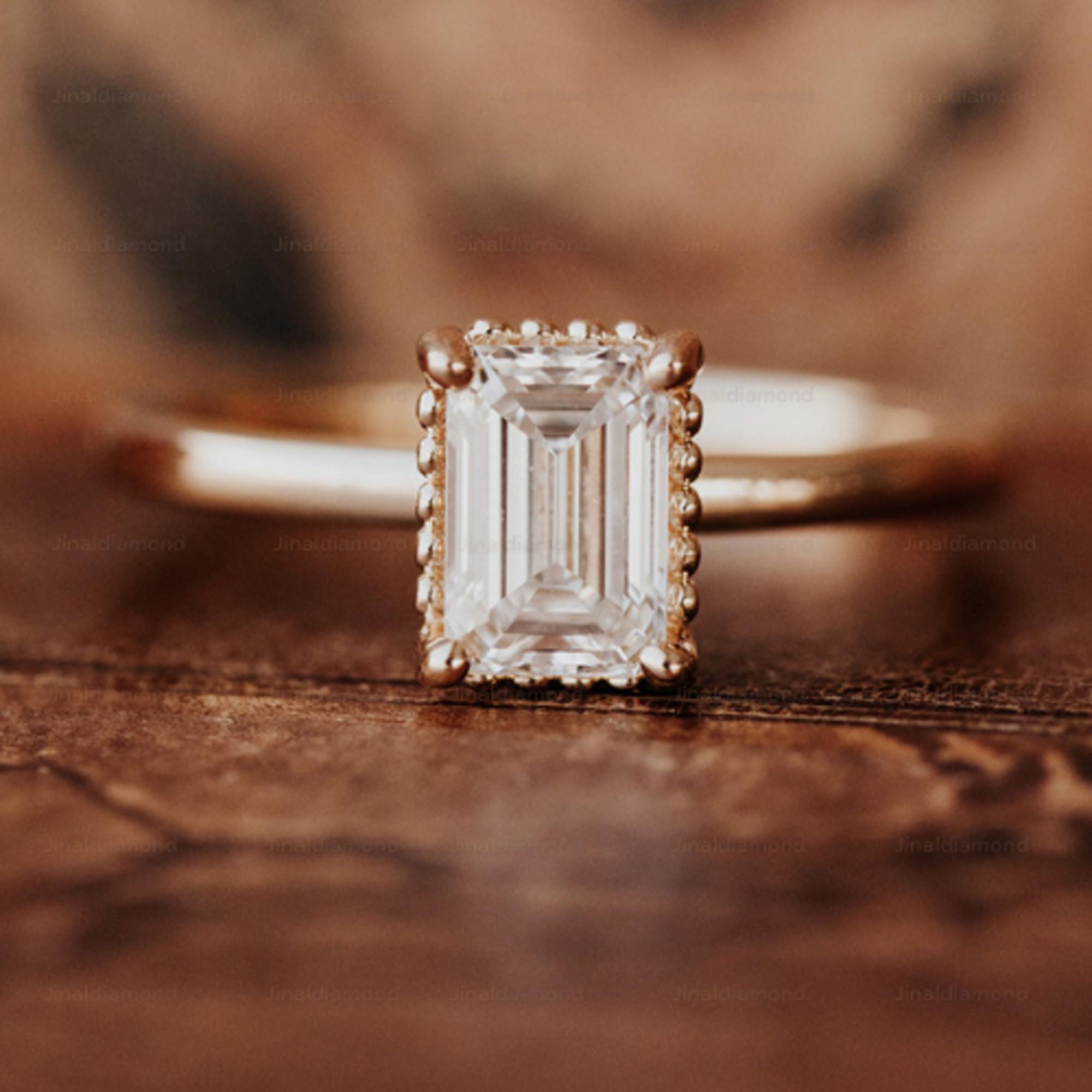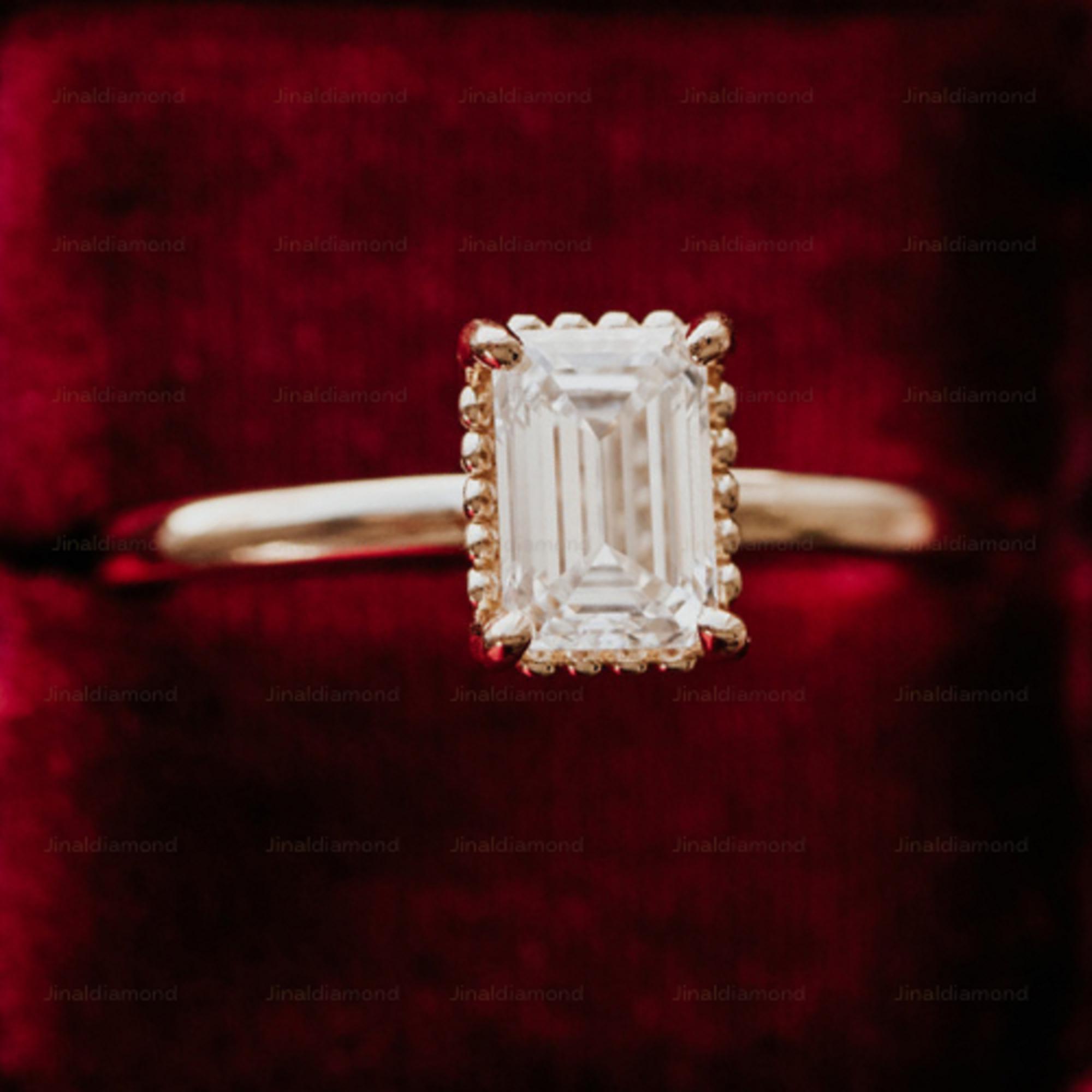 Emerald Cut Moissanite Engagement Ring 14K Gold, Vintage Inspired Art Deco Wedding Ring for Her, Minimalist Milgrain Bezel Set Emerald Ring