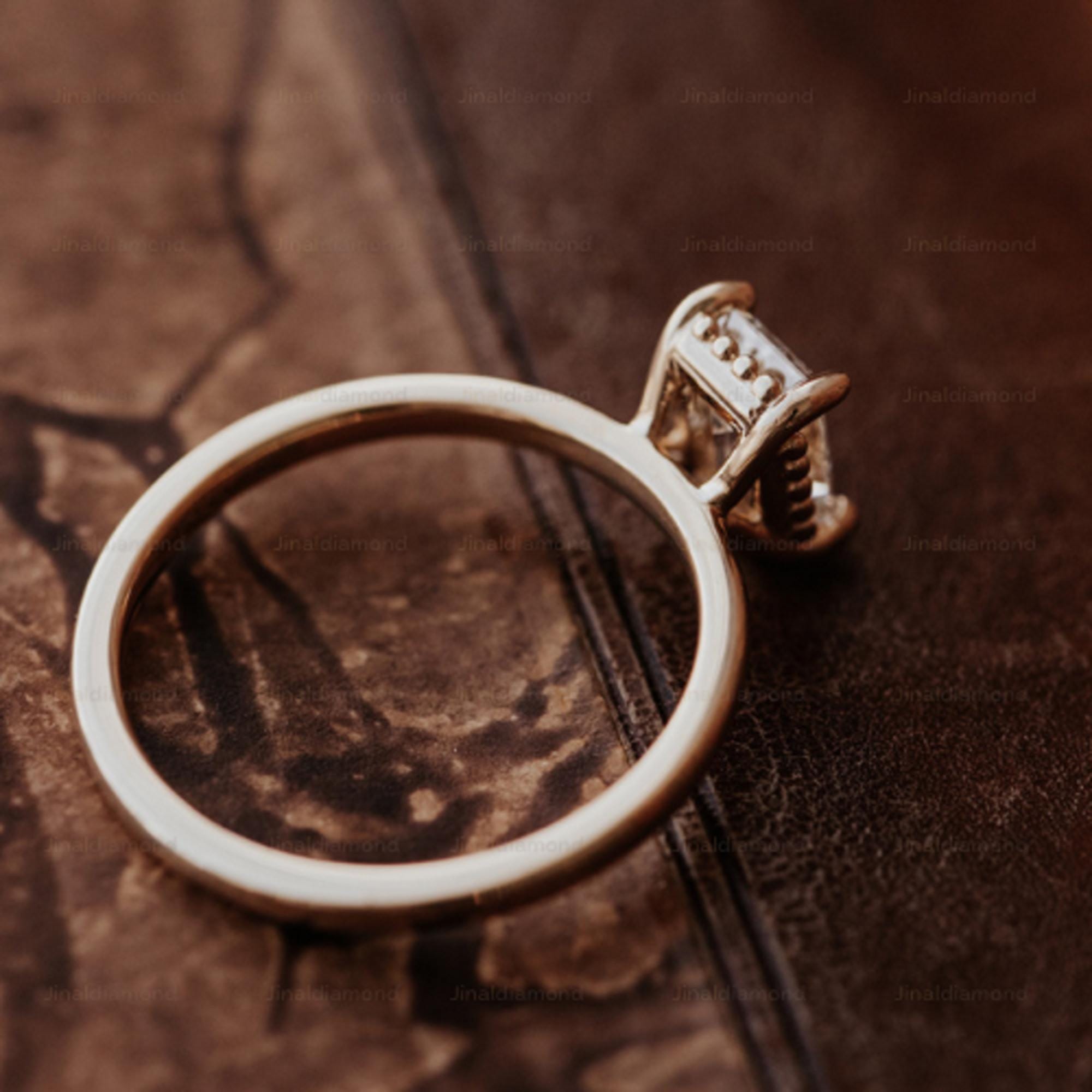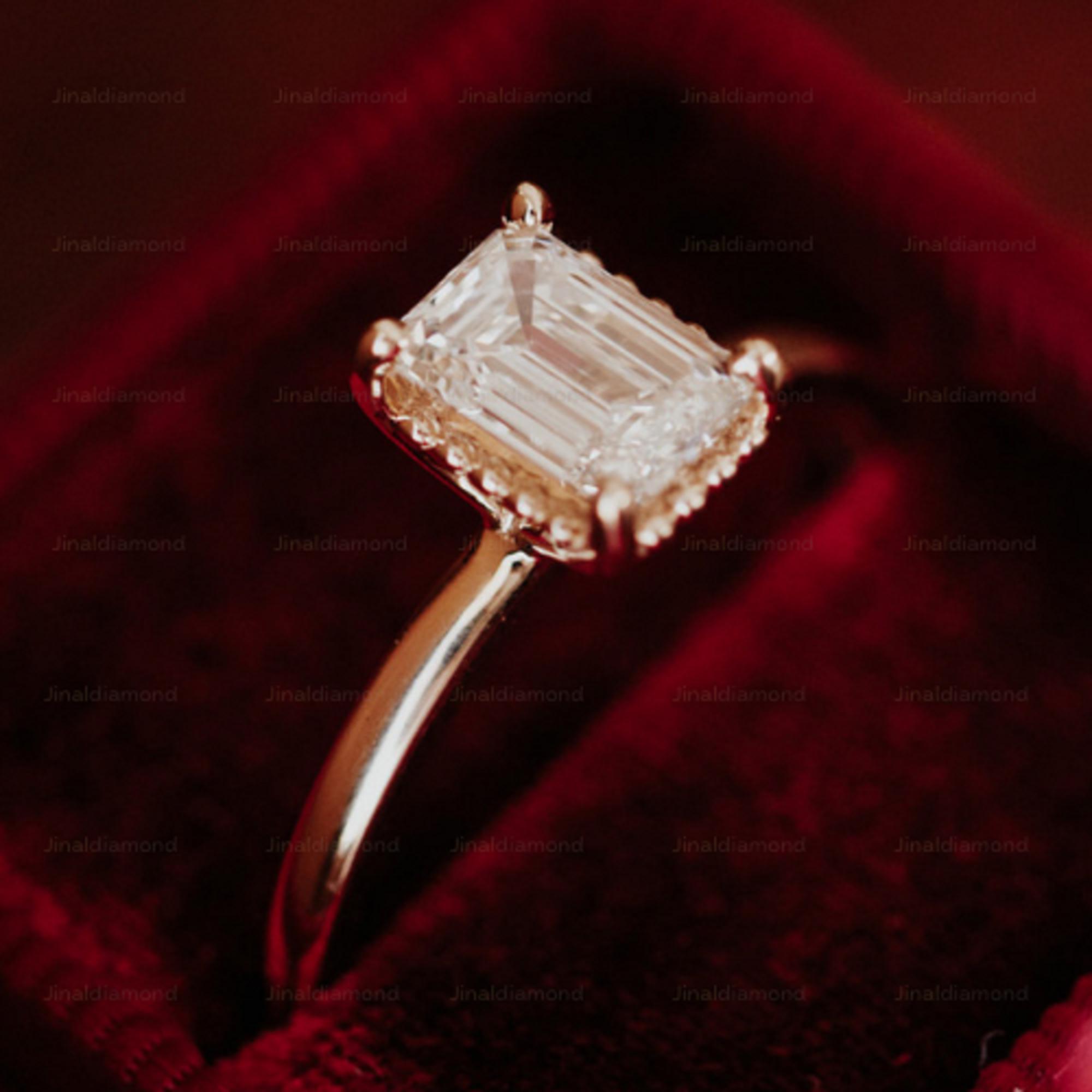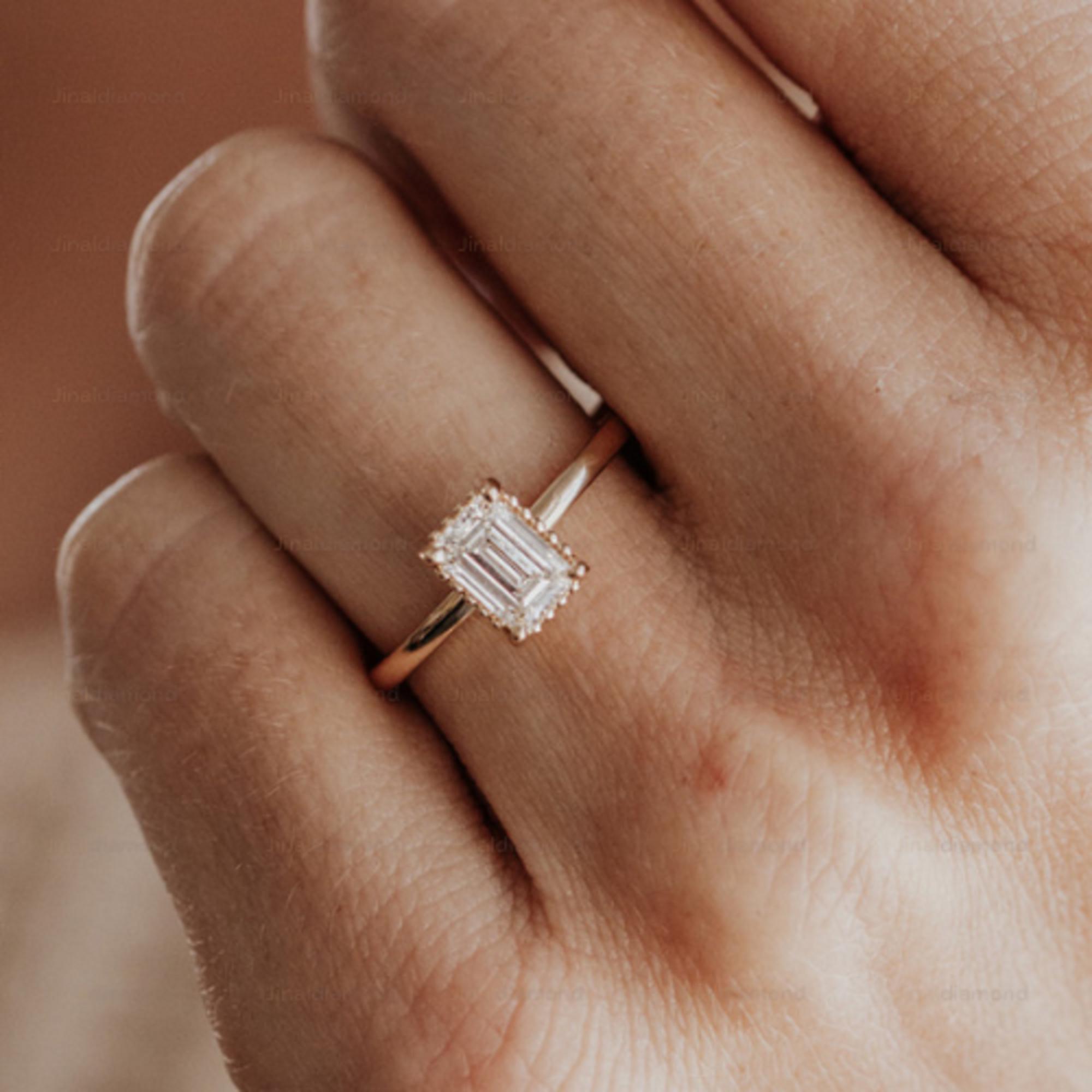 Emerald Cut Moissanite Engagement Ring 14K Gold, Vintage Inspired Art Deco Wedding Ring for Her, Minimalist Milgrain Bezel Set Emerald Ring
