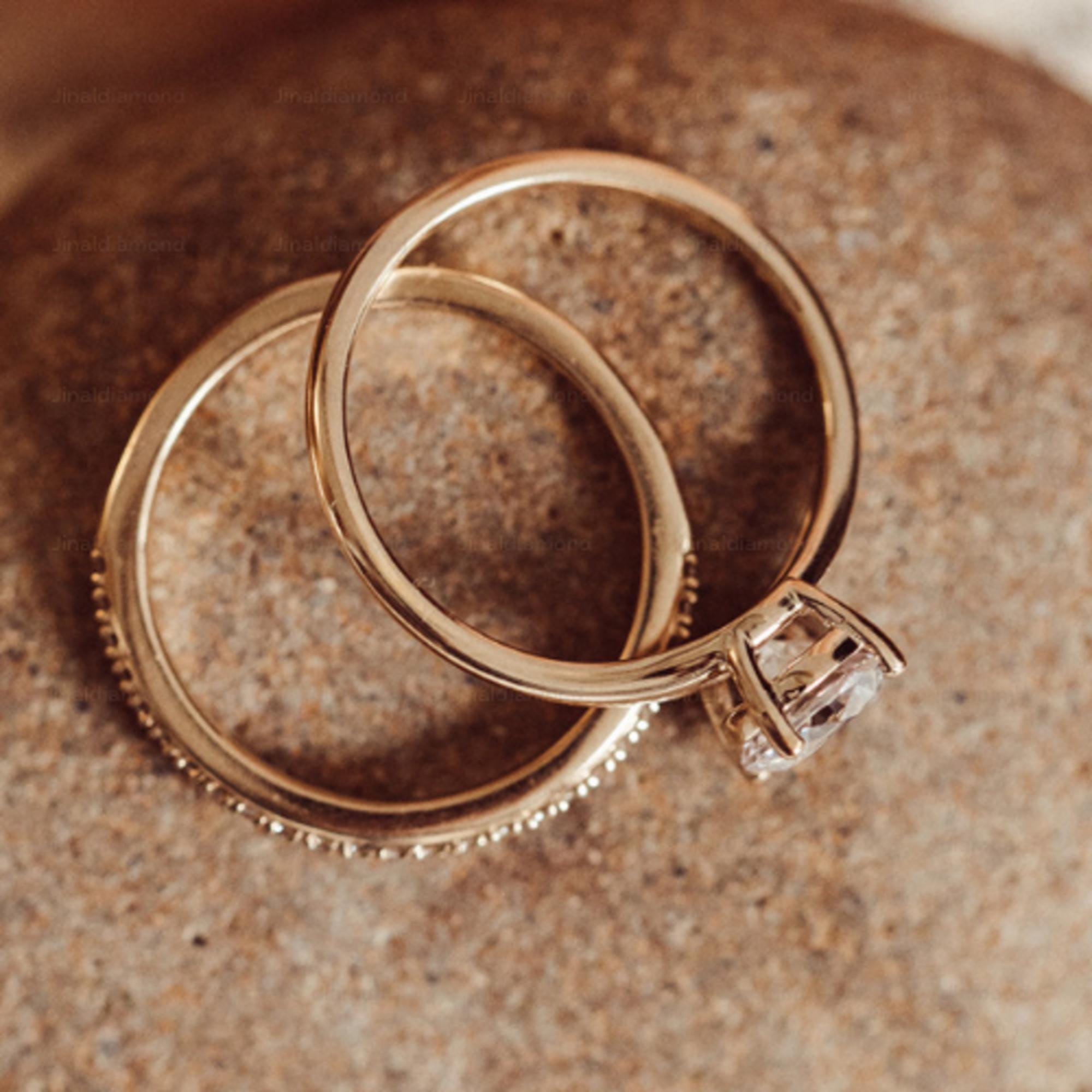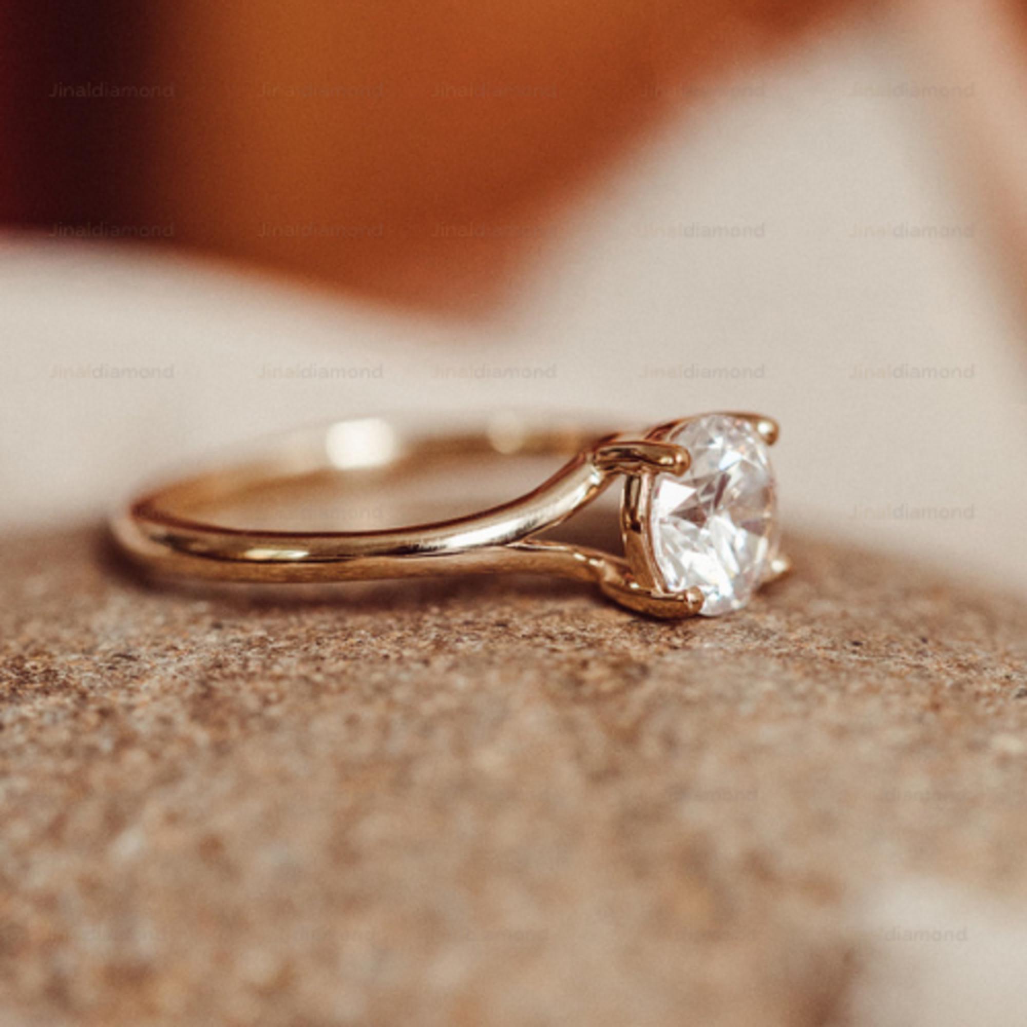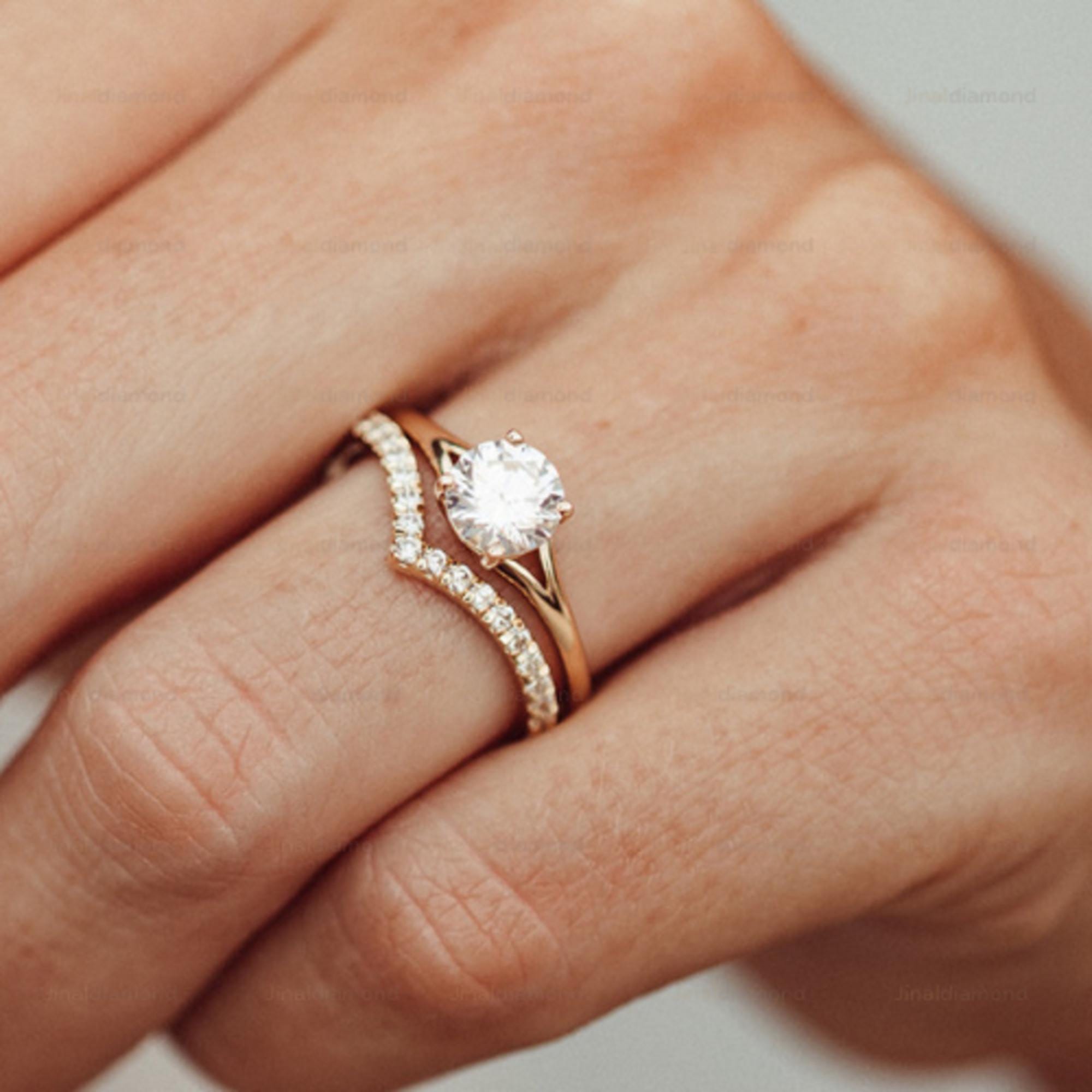 Minimalist Round Cut Moissanite Solitaire Engagement Ring Set, 14k Solid Gold Dainty Wedding Ring Set, Delicate Curved Bridal Band Set