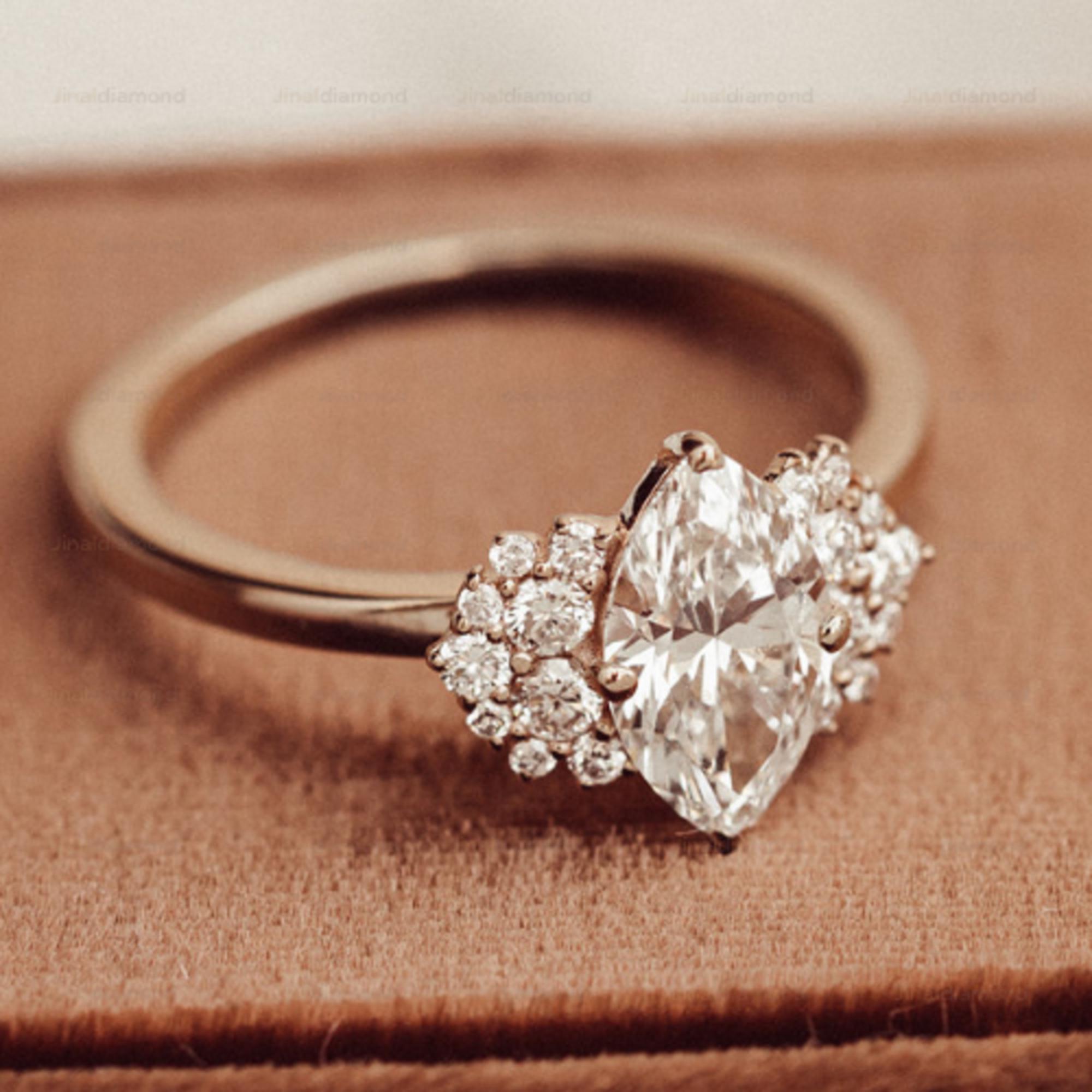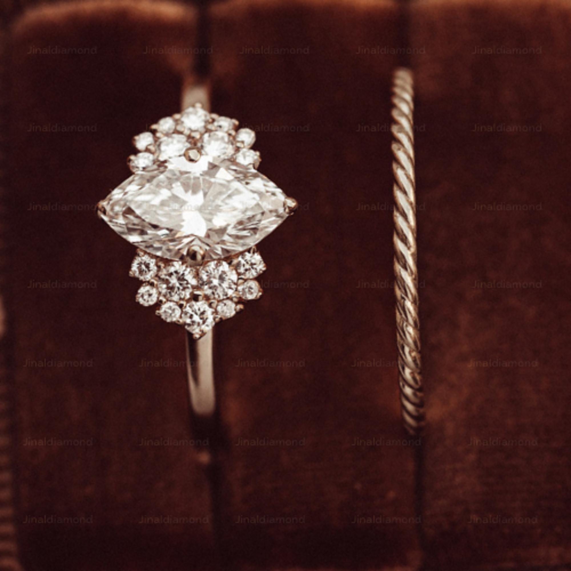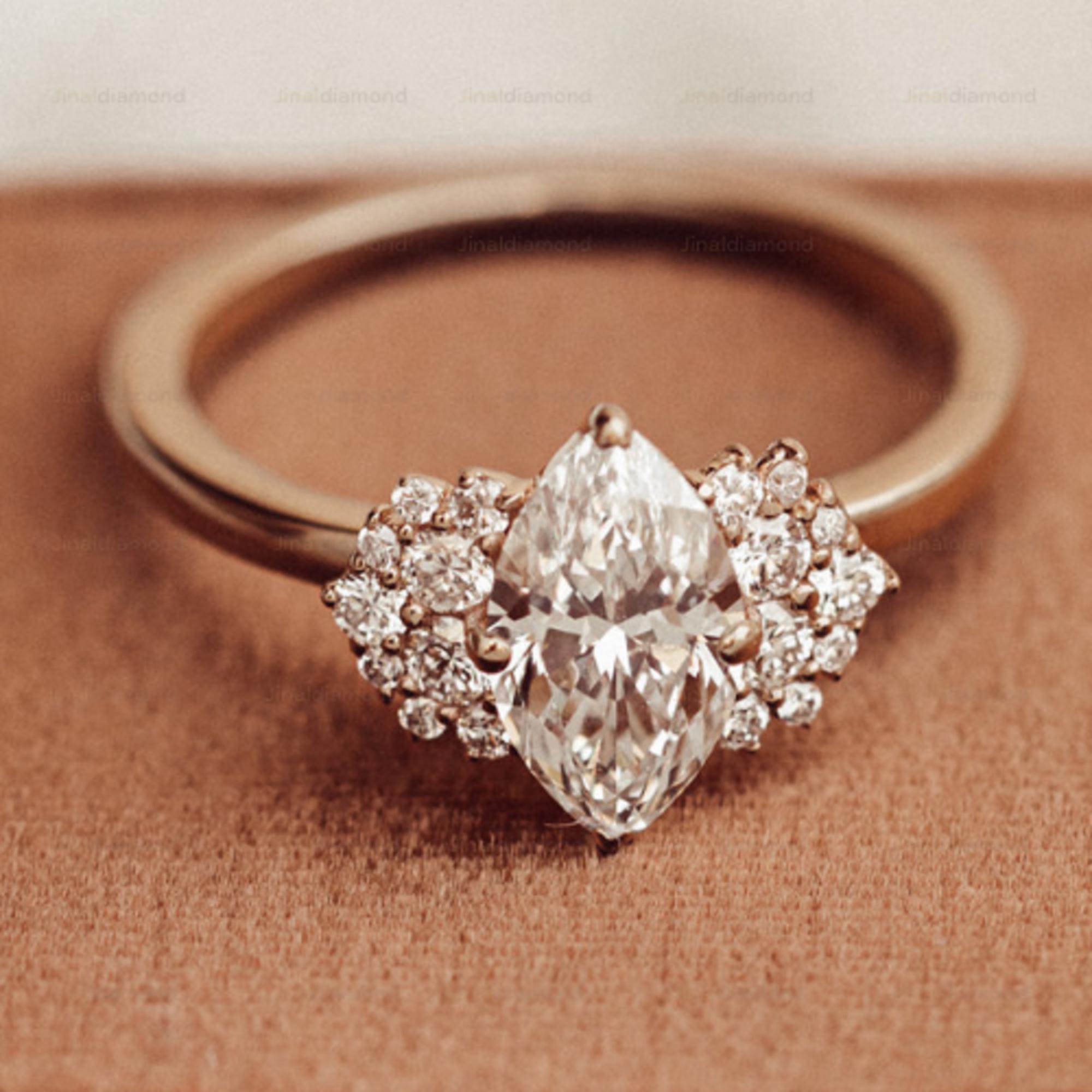 Marquise Moissanite Engagement Ring 14k Gold, Vintage Cluster Diamond Ring, Unique Bridal Set, Marquise Cut Promise Ring, Art Deco Jewelry