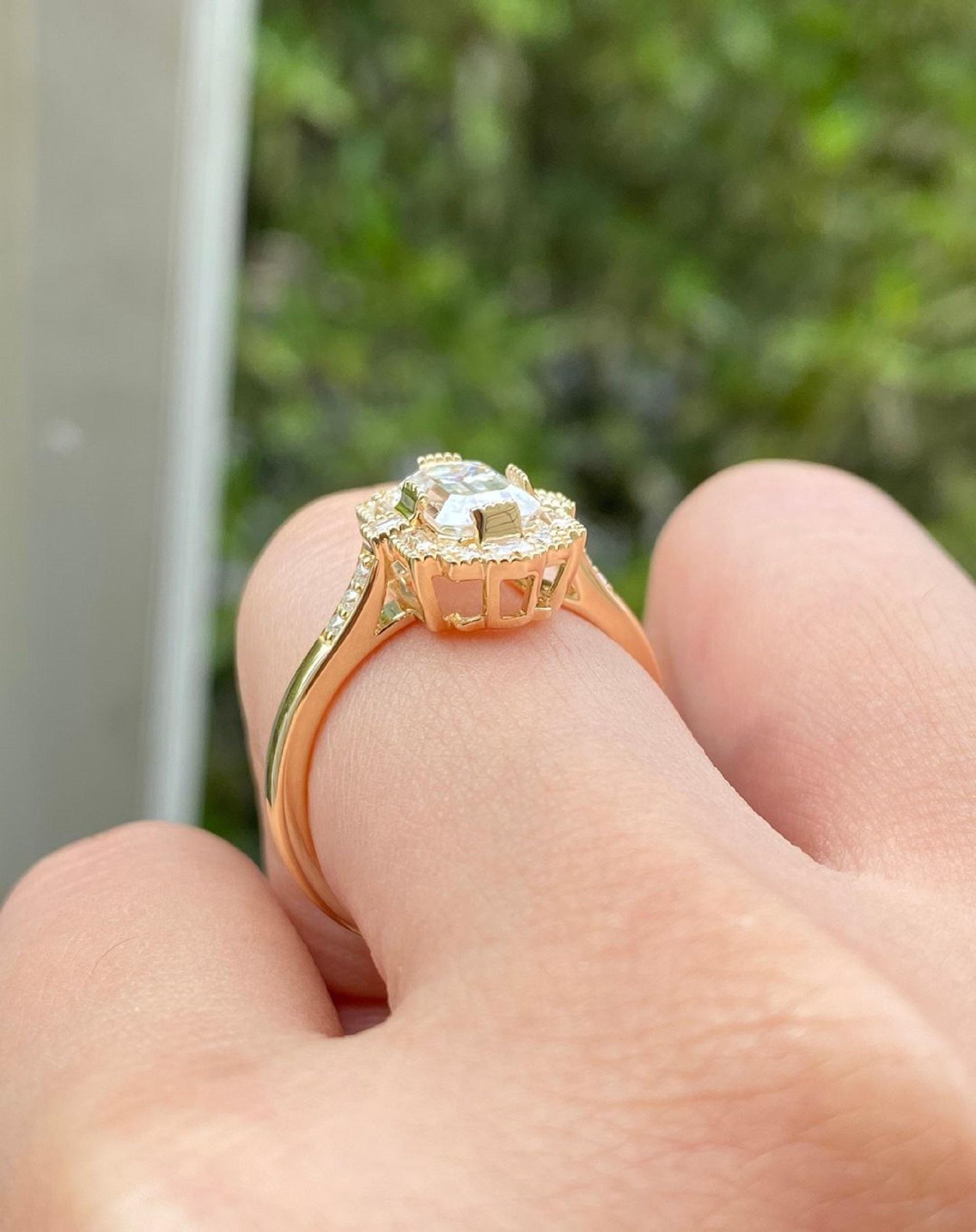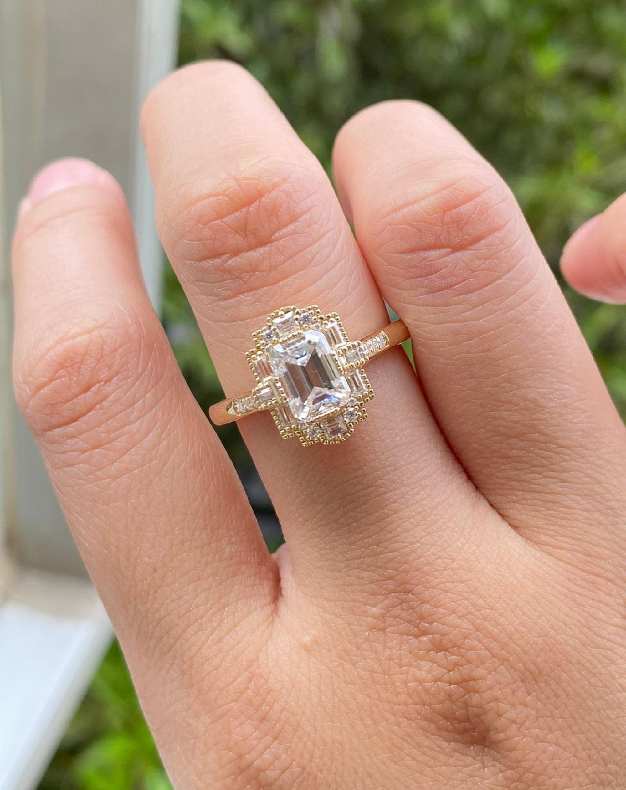 Emerald Cut Moissanite Engagement Ring in 14k Gold Art Deco Wedding Ring Vintage Style Emerald Halo Anniversary Ring Unique Baguette Ring