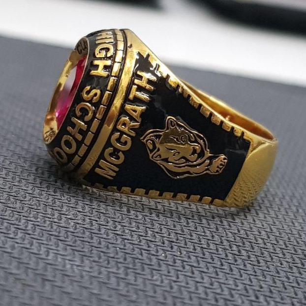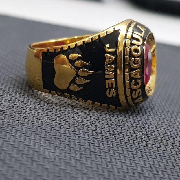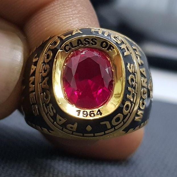 Vintage High School Class Ring 1964 Gold Tone Graduation Ring with Red Gemstone, Classic College Alumni Signet Ring for Men Women