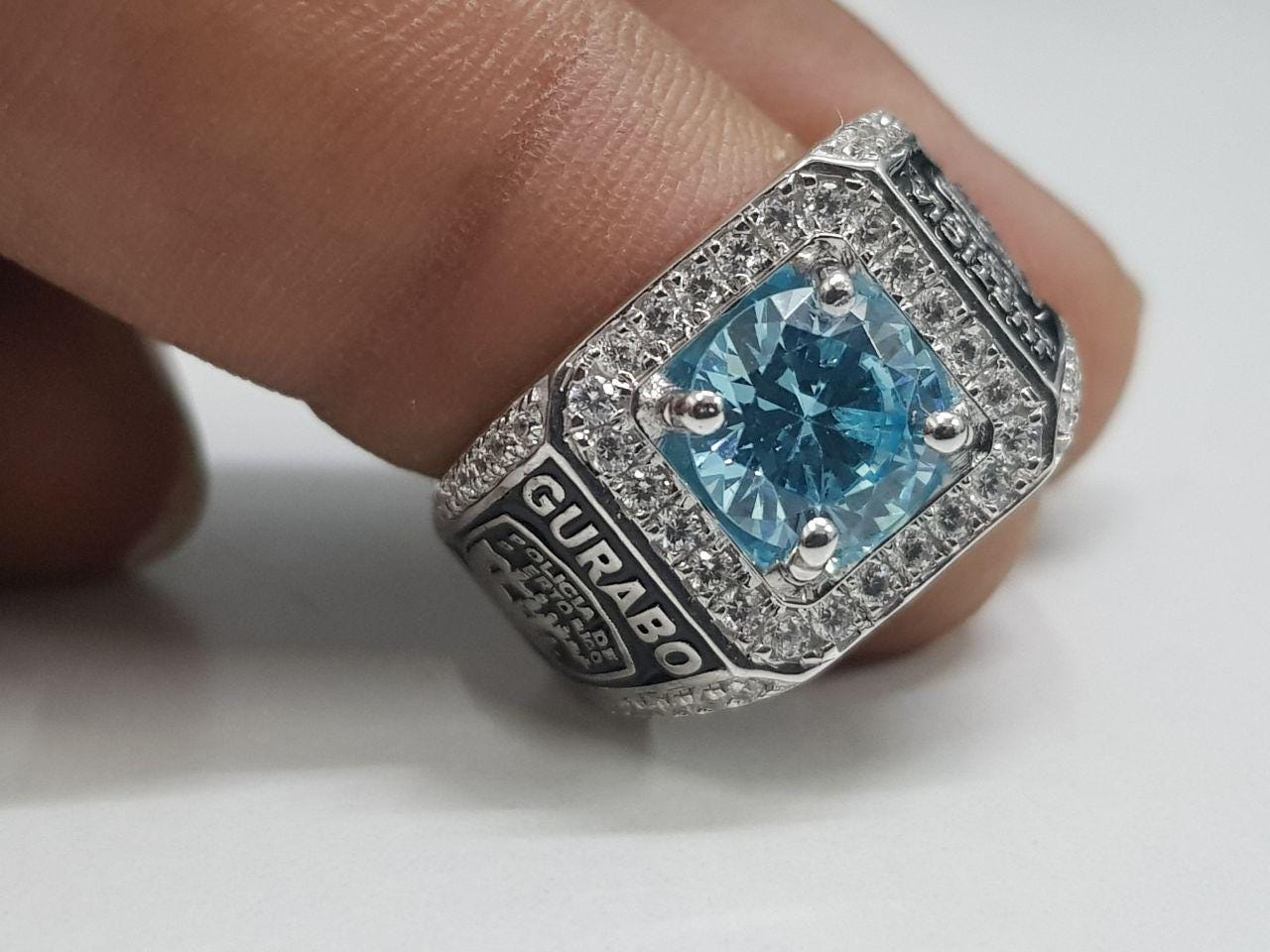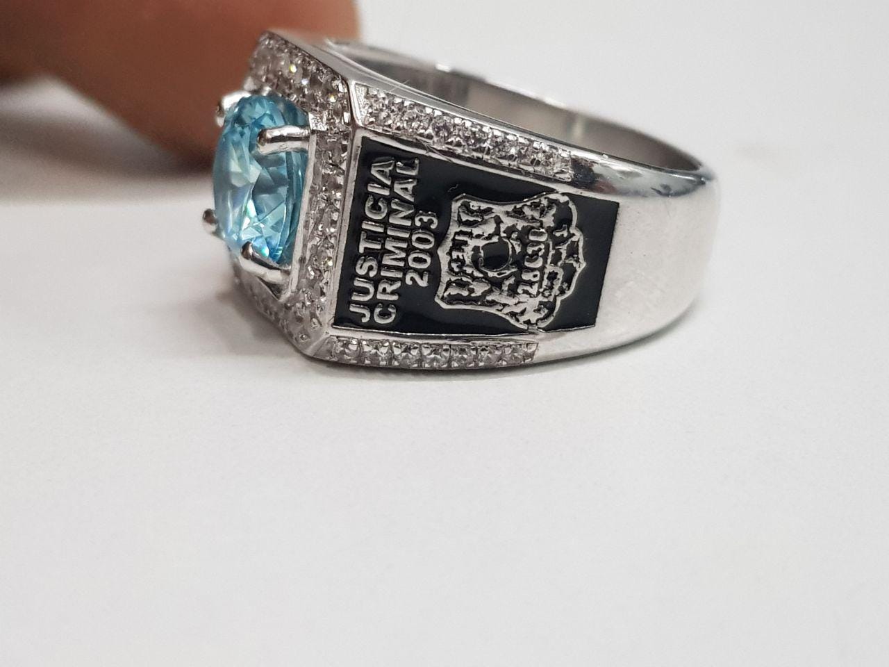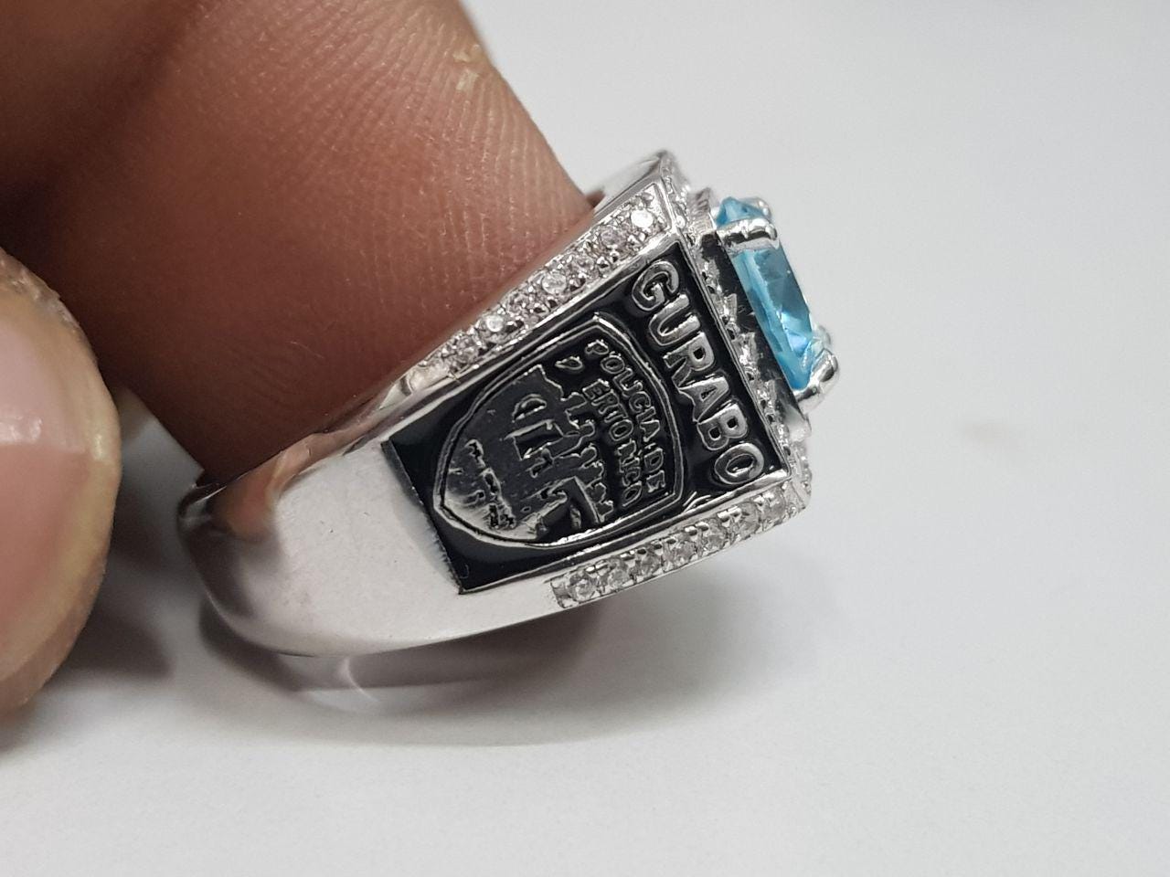 High School Class Ring Silver, Graduation College Alumni Ring with Blue Gemstone, Custom School Signet Ring for Men Women