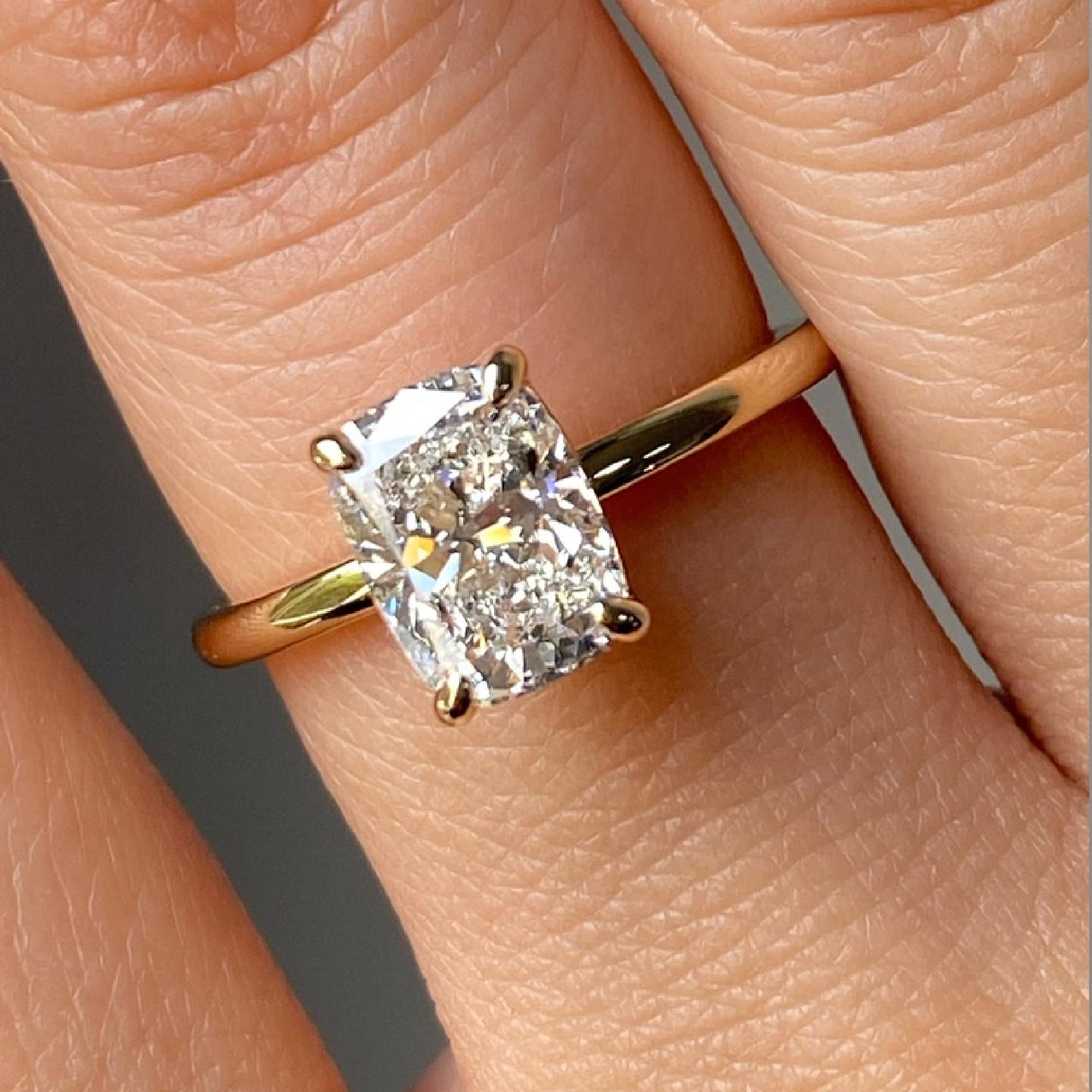 Celebrate timeless elegance with this 1.8CT Elongated Cushion Lab Grown Diamond Engagement Ring, beautifully set in 14K solid gold. The elongated cushion cut creates a romantic sparkle with a modern twist, making it the perfect symbol of everlasting love. Its minimalist solitaire design highlights the brilliance of the center stone, while the delicate band ensures a graceful, comfortable fit.