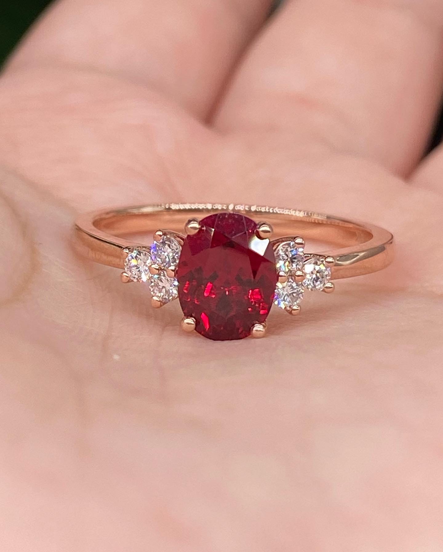 Oval Cut Red Ruby Engagement Ring, 14k Solid Gold Cluster Ring, Oval Red Gemstone Delicate Anniversary Ring, Statement Valentine Gift Ring