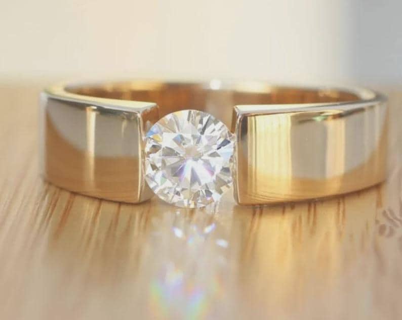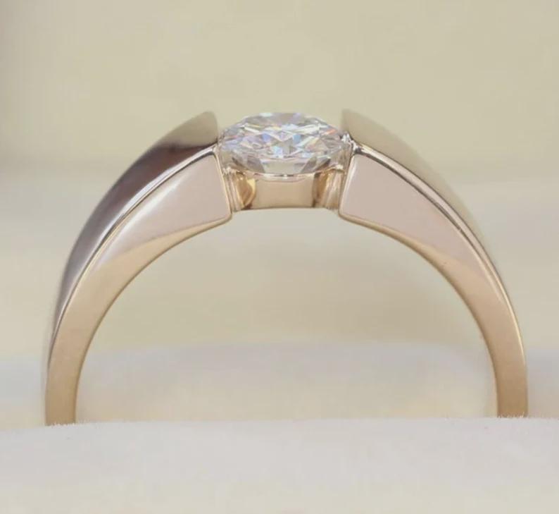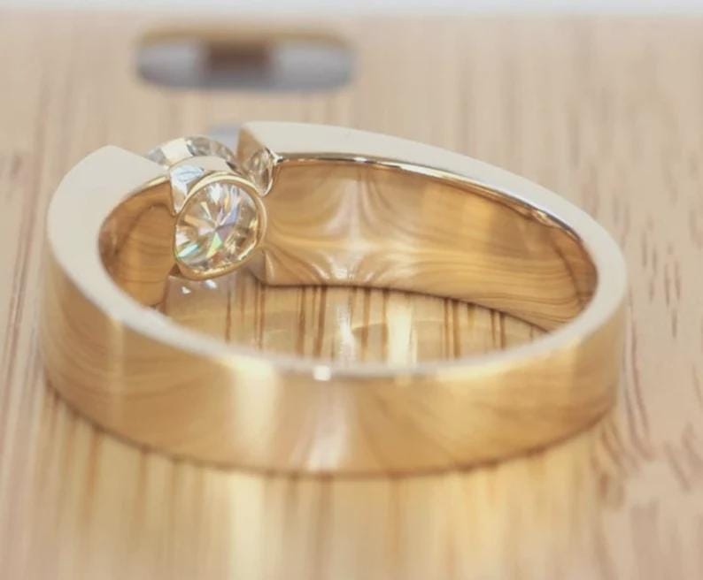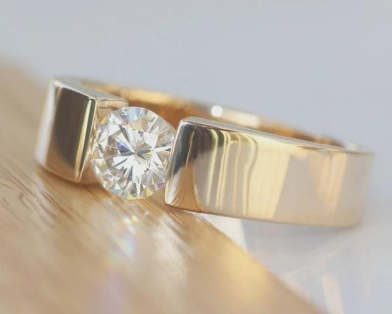Modern Tension Set Moissanite Engagement Ring for Women, 1ct Round Brilliant Cut Solitaire Ring, Minimalist Wide Band Wedding Ring for Her