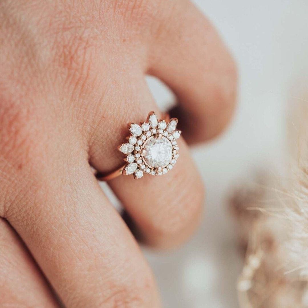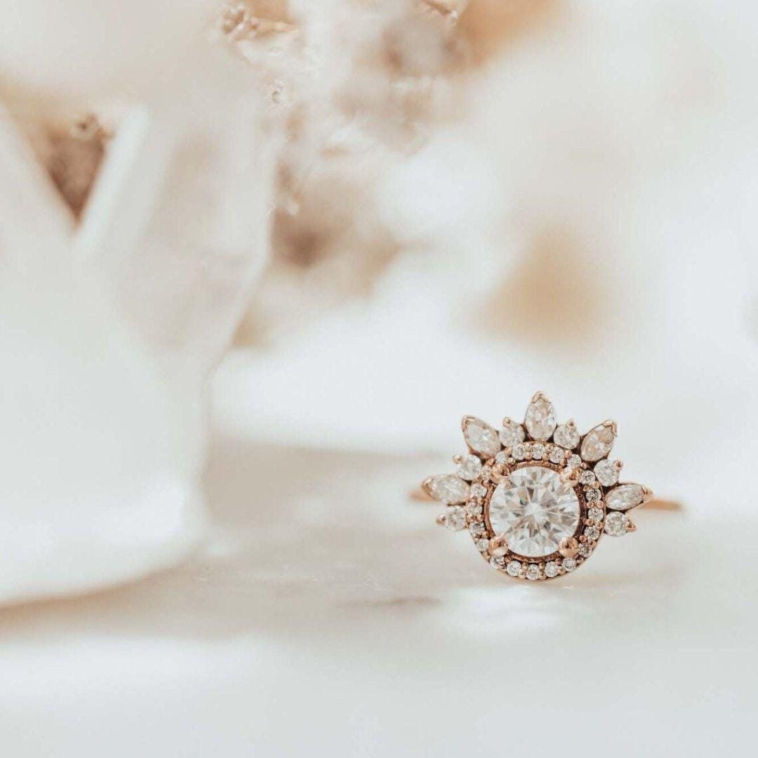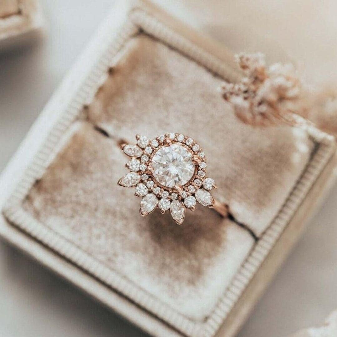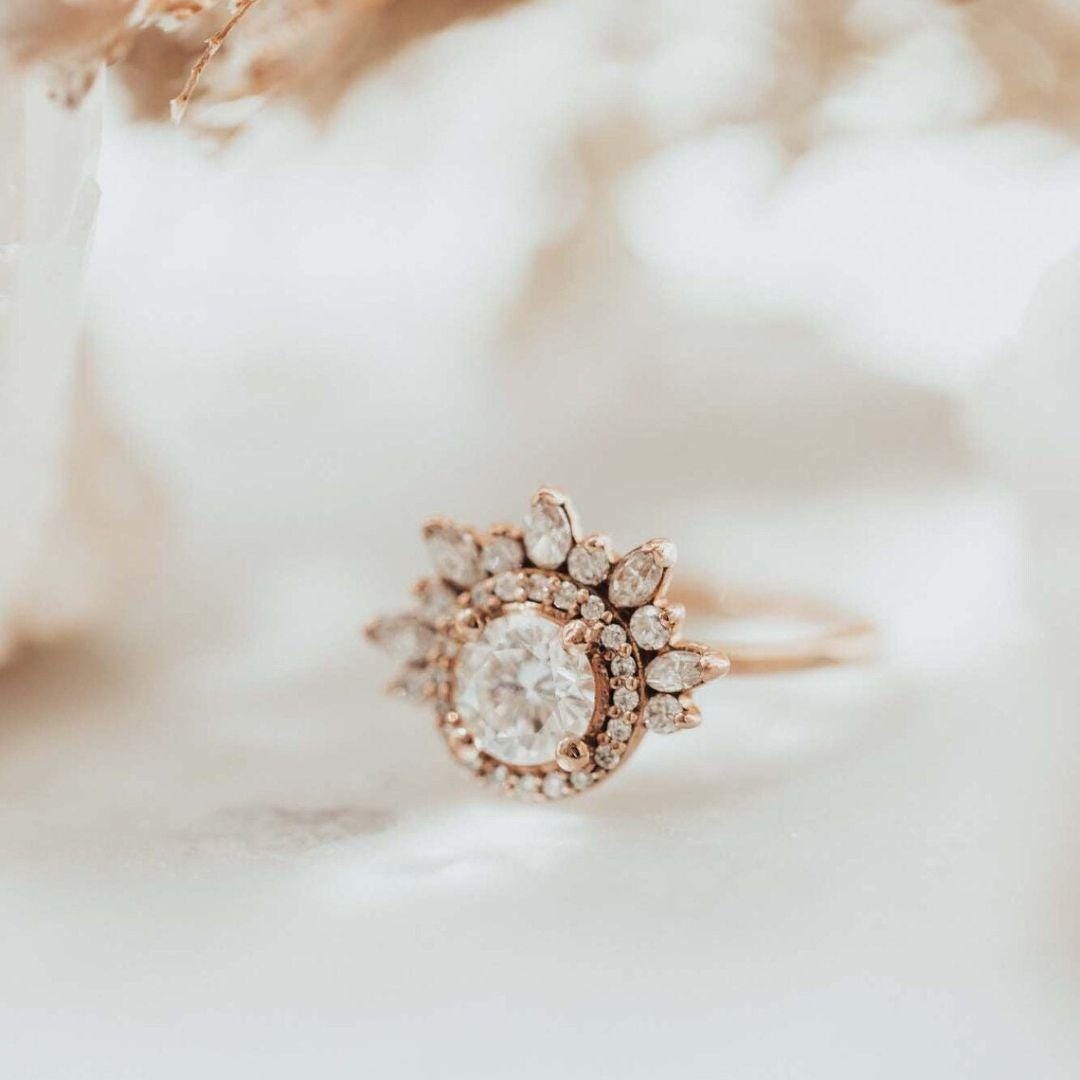14K Gold Sunburst Engagement Ring, Round Moissanite Halo Ring, Art Deco Tiara Wedding Ring for Women, Unique Marquise Diamond Cluster Ring