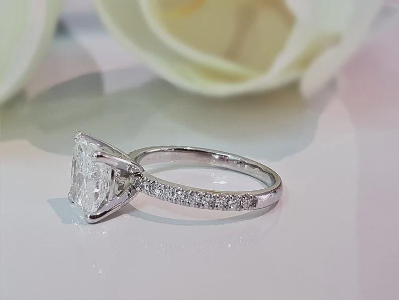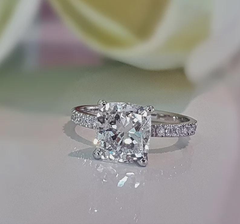 Cushion Cut Moissanite Stone Engagement Ring, 14k Solid White Gold Wedding Ring, Solitaire with Accent Wedding Ring, Art Deco Promise Ring