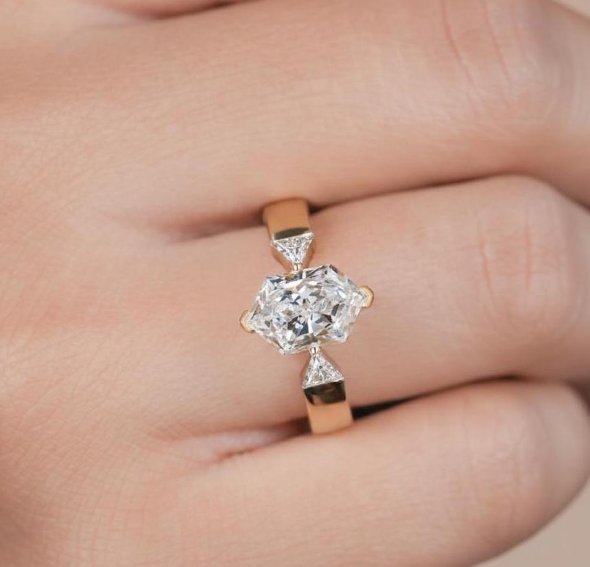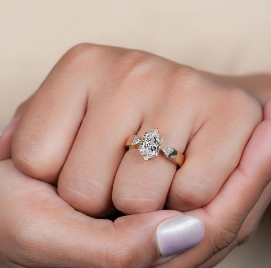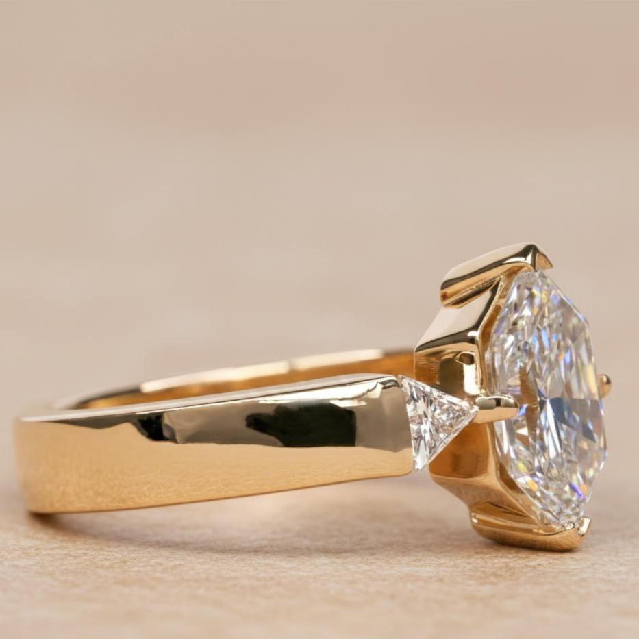 1 CT Hexagon Lab Grown Diamond Engagement Ring 14K Yellow Gold Moissanite Three Stone Unique Bridal Jewelry Modern Alternative Promise Ring