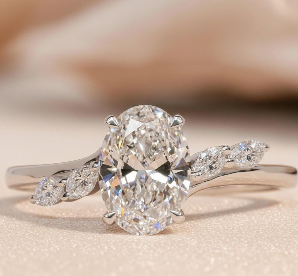 2 CT Oval Moissanite Engagement Ring with Marquise Side Stones 14K Gold Five Stone Wedding Ring Lab Grown Diamond Anniversary Gift for Her