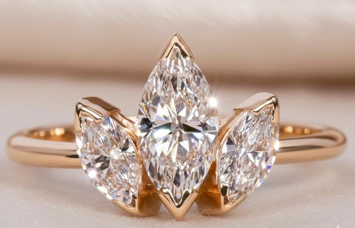 2.5 CT Marquise Cut Lab Grown Diamond Engagement Ring Three Stone Ring in 14K Gold Unique Lotus Flower Bridal Trio Moissanite Promise Ring