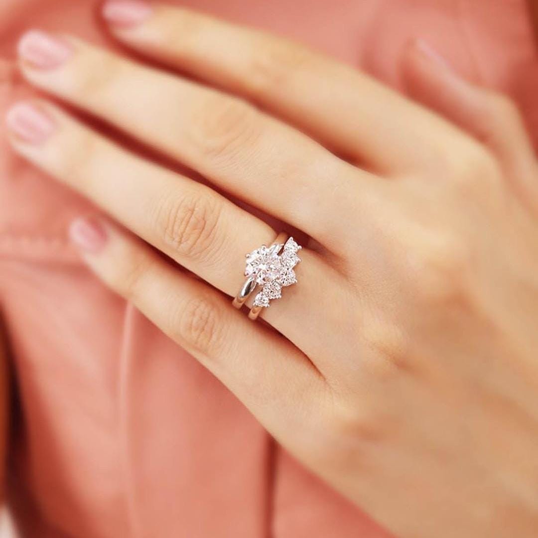 Floral Cluster Lab Grown Diamond Engagement Ring Set Vintage Inspired Wedding Ring Set White Gold Bridal Set Unique Moissanite Ring for Her
