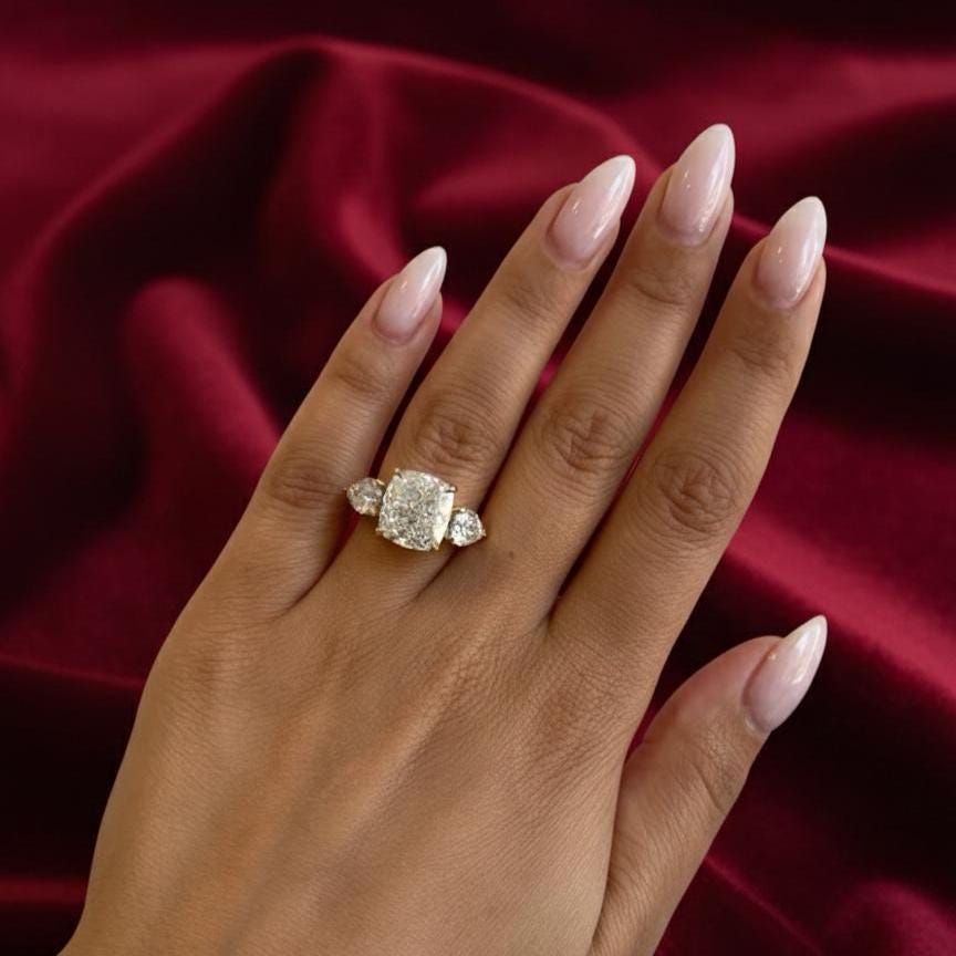 2 CT Cushion Cut Moissanite Engagement Ring, Three Stone Gold Ring, Pear Side Stone Ring, Lab Grown Diamond Alternative Bridal Ring For Her