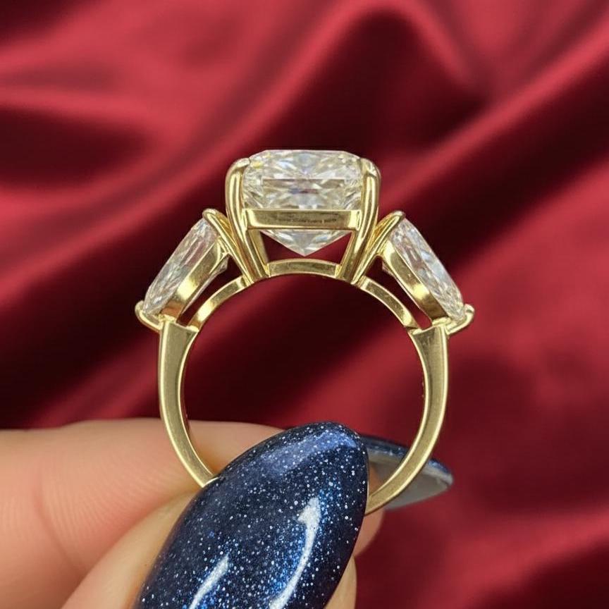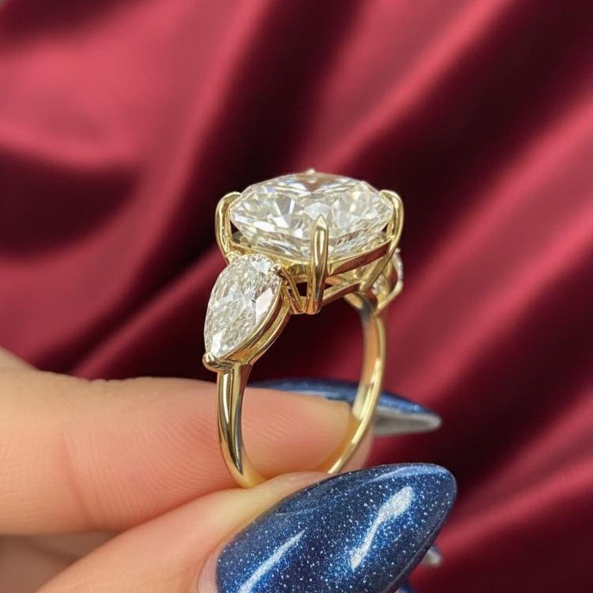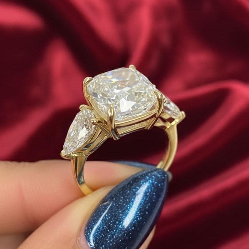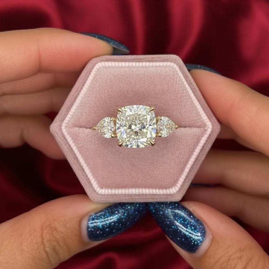 2 CT Cushion Cut Moissanite Engagement Ring, Three Stone Gold Ring, Pear Side Stone Ring, Lab Grown Diamond Alternative Bridal Ring For Her / Art Deco Ring / Engagement Ring / Wedding Ring / Diamond Ring / Handmade Ring / Fine Jewelry / Spiral Ring / Rings for Women / Stunning Ring / Personalized Gift / Promise Ring / Proposal Ring / Round Pave Ring / Birthday Gift / Unique Ring / Gift for Girlfriend / Pear Lab Diamond / Lab Grown Diamond