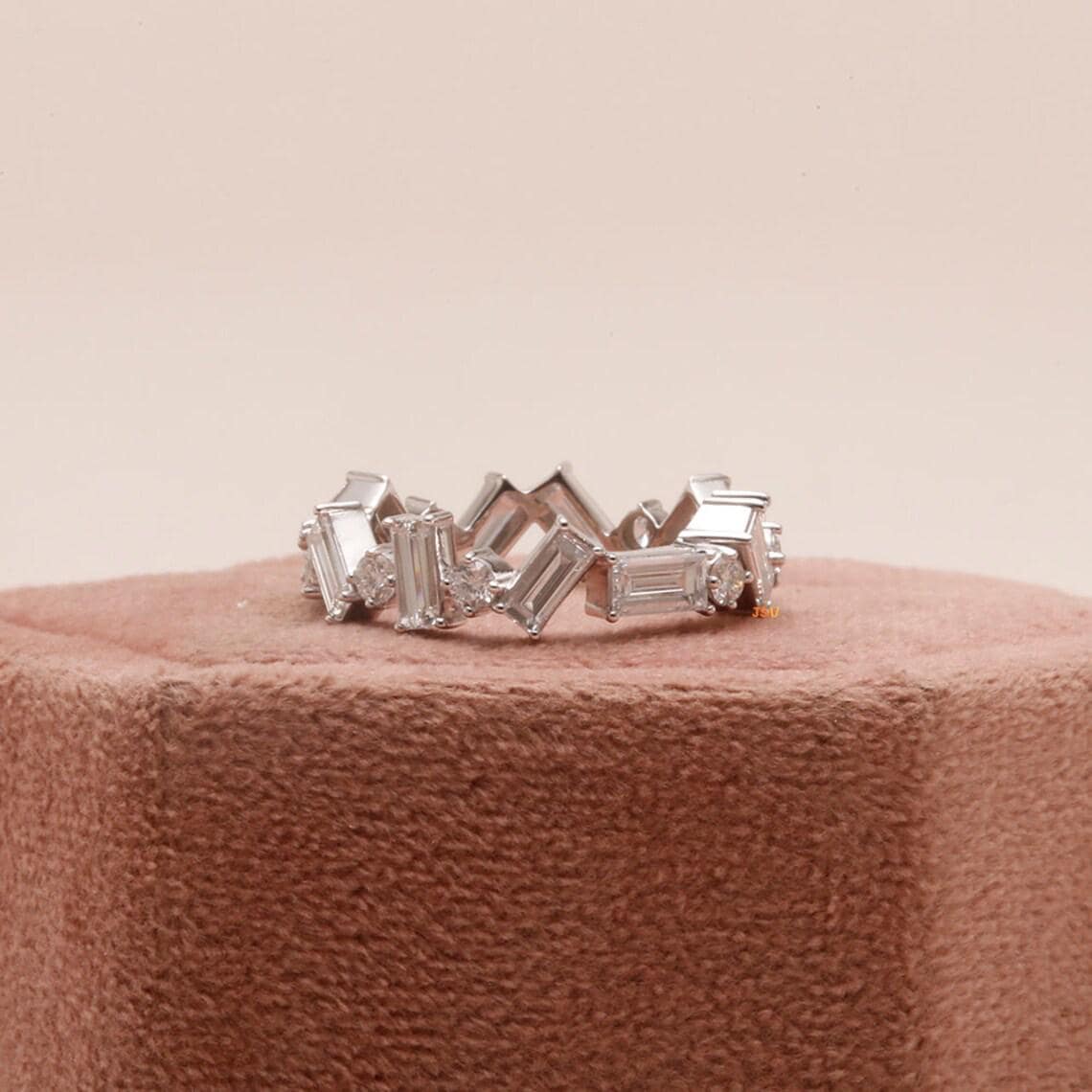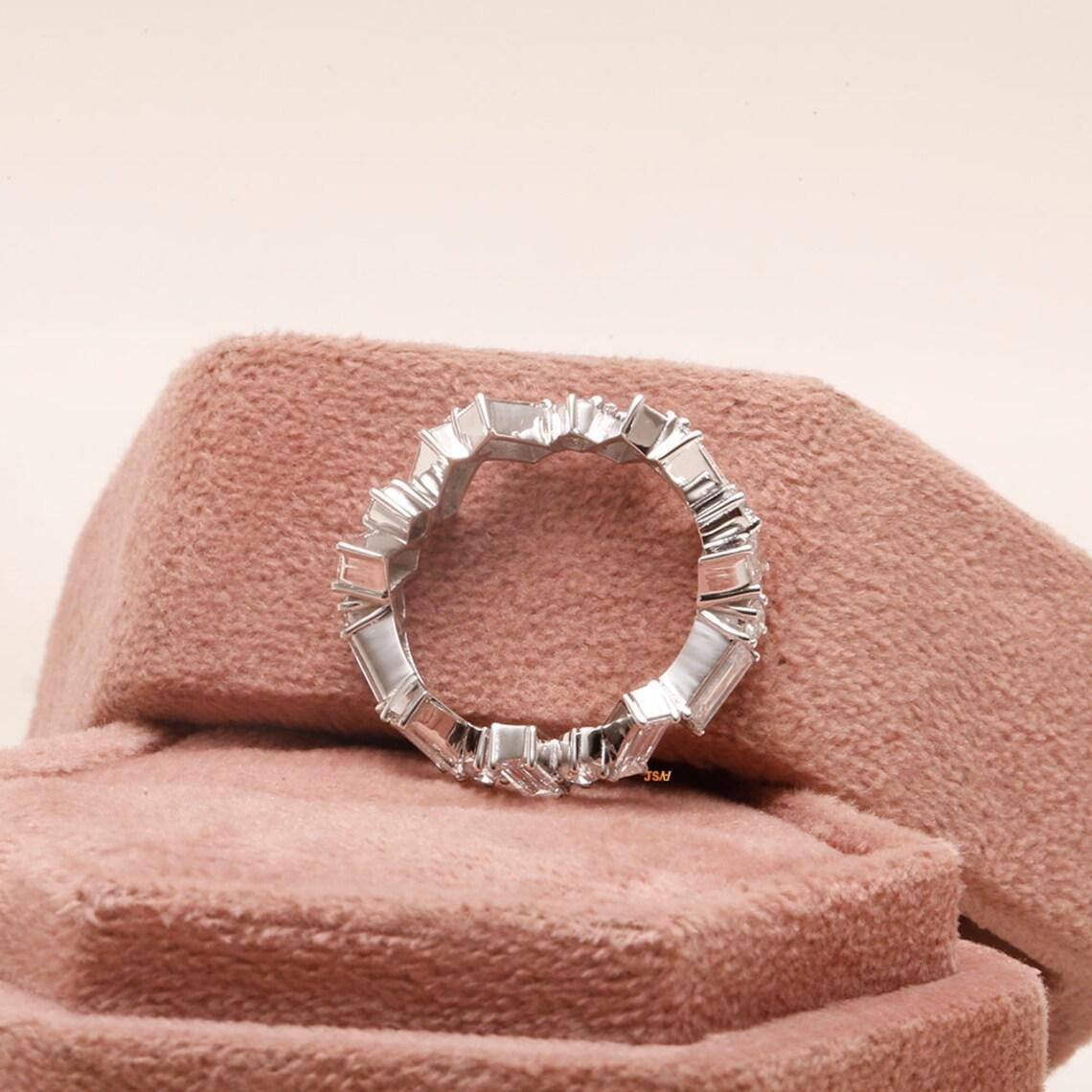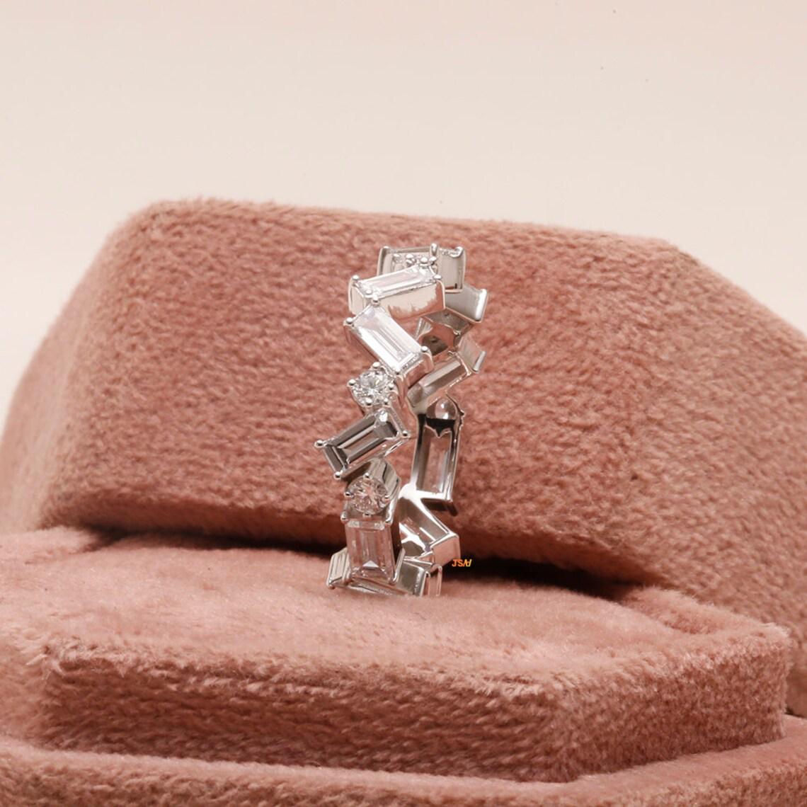 Baguette and Round Moissanite Wedding Band, 14K White Gold Zigzag Eternity Ring, Art Deco Baguette Diamond Band, Stacking Ring for Her