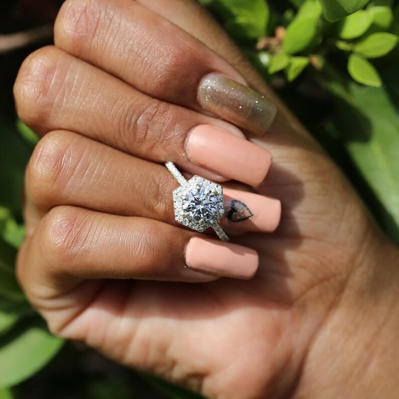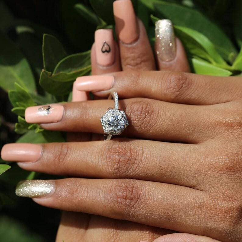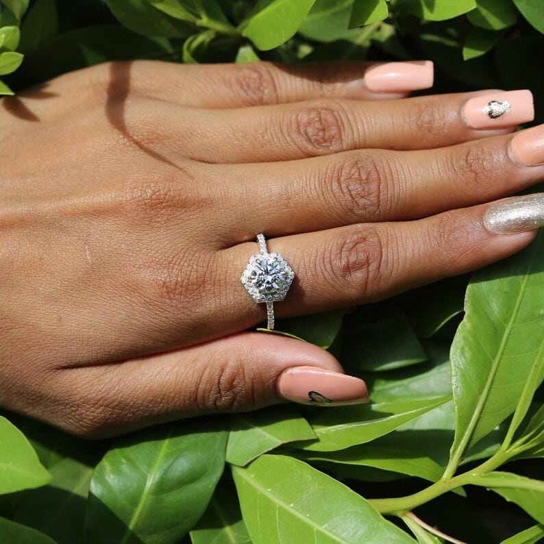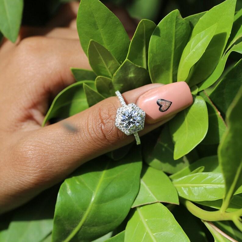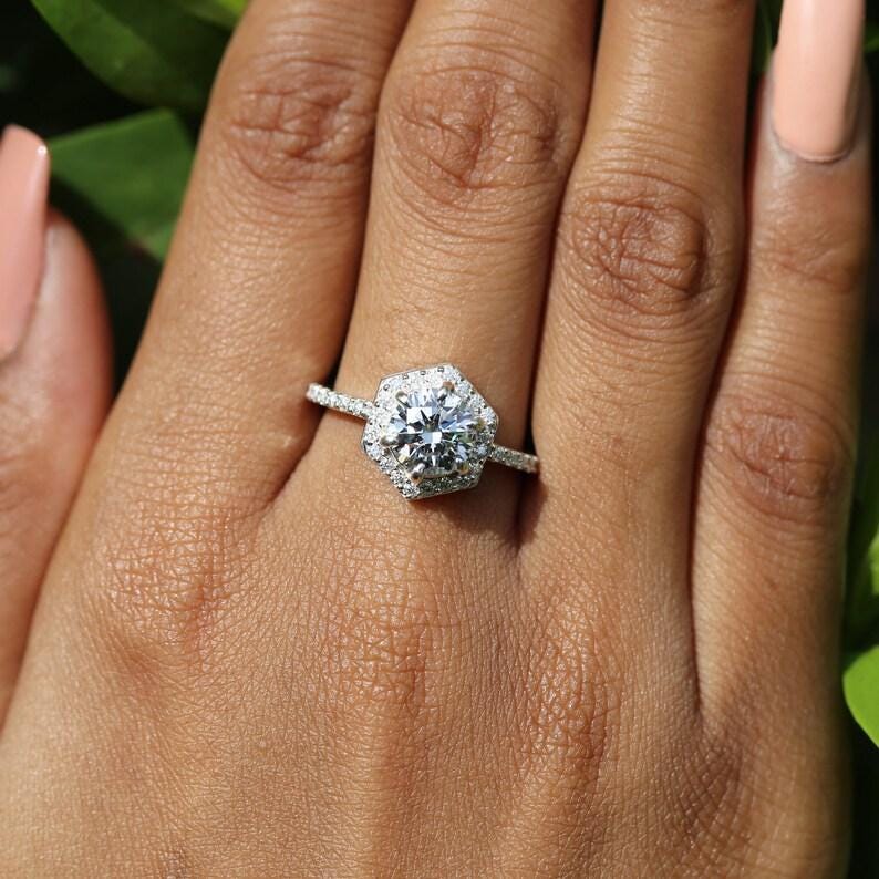 Hexagon Halo Engagement Ring, Round Cut Moissanite Diamond Ring, 14k White Gold Art Deco Wedding Ring, Unique Bridal Jewelry for Her