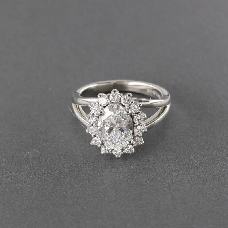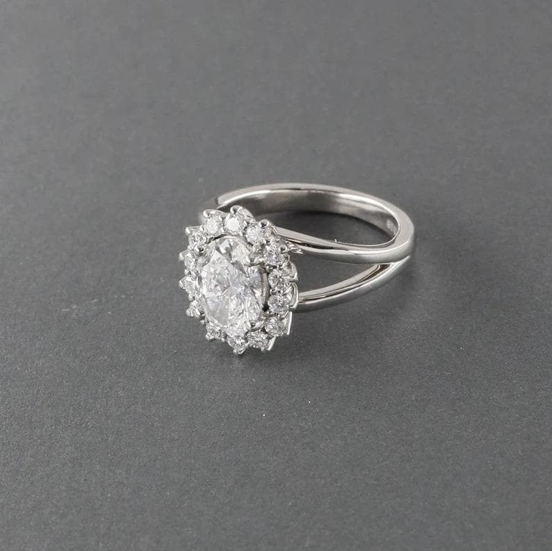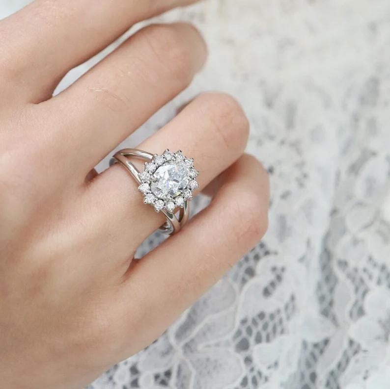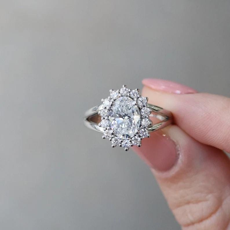 Oval Cut Moissanite Engagement Ring, Diamond Halo Wedding Ring for Women, 14K White Gold Split Shank Promise Ring, Vintage Style Bridal Ring