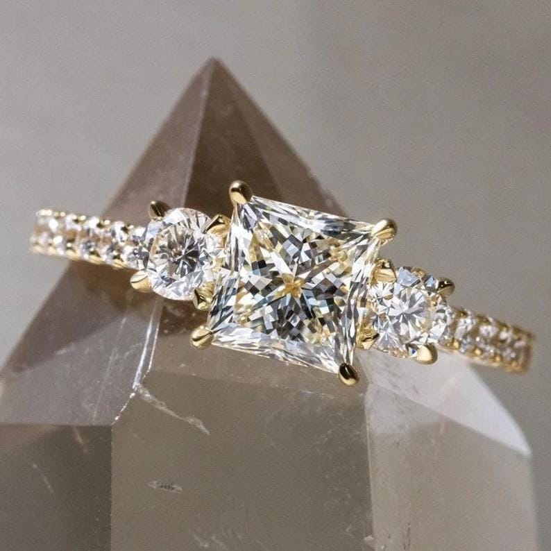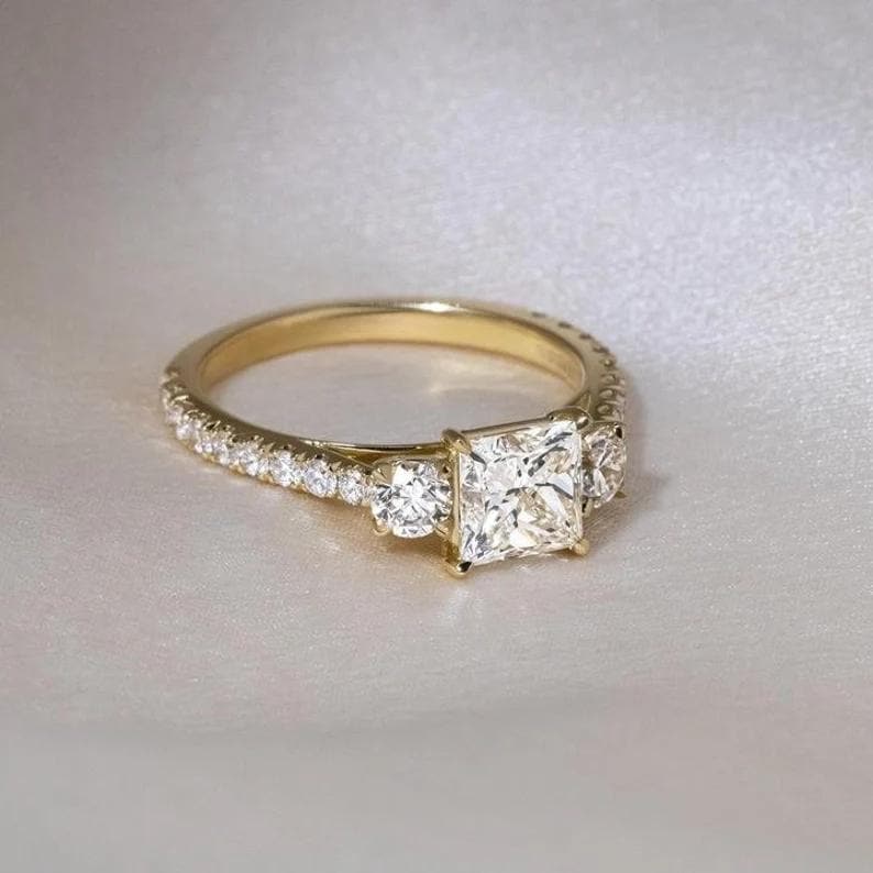 Princess Cut Diamond Engagement Ring in 14k Gold, Three Stone Moissanite Wedding Ring for Women, Pave Band Anniversary Gift, Bridal Jewelry / Princess Cut Ring / Art Deco Ring / Vintage Style Ring / Promise Ring / Proposal Ring / Yellow Gold Ring / Statement Ring