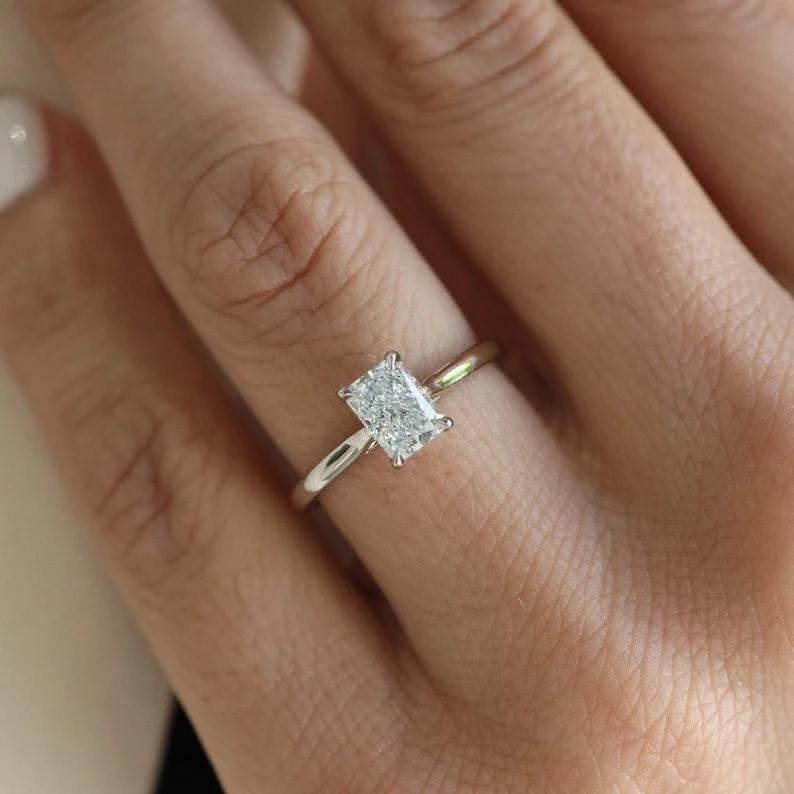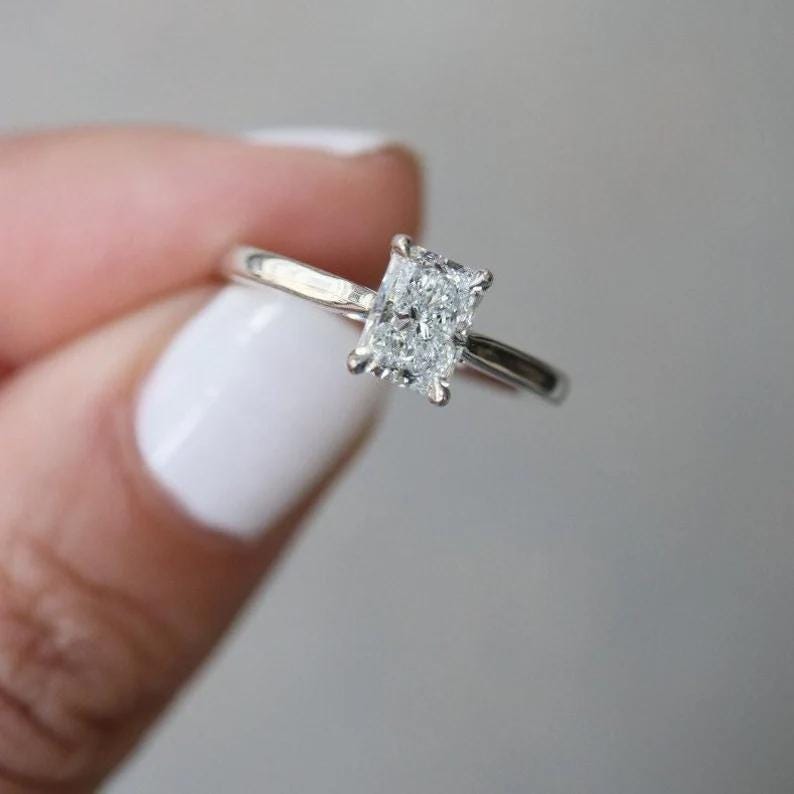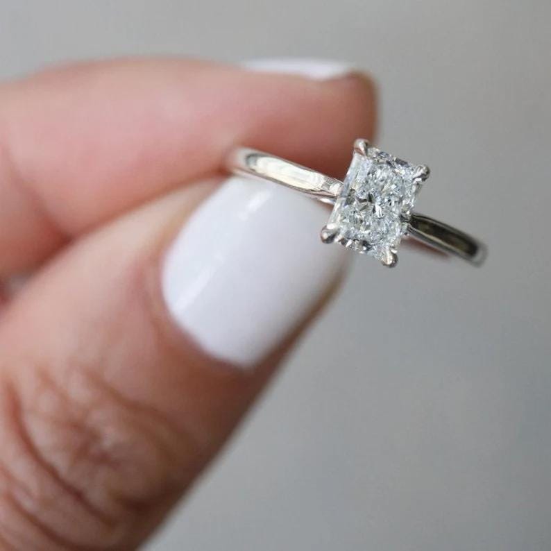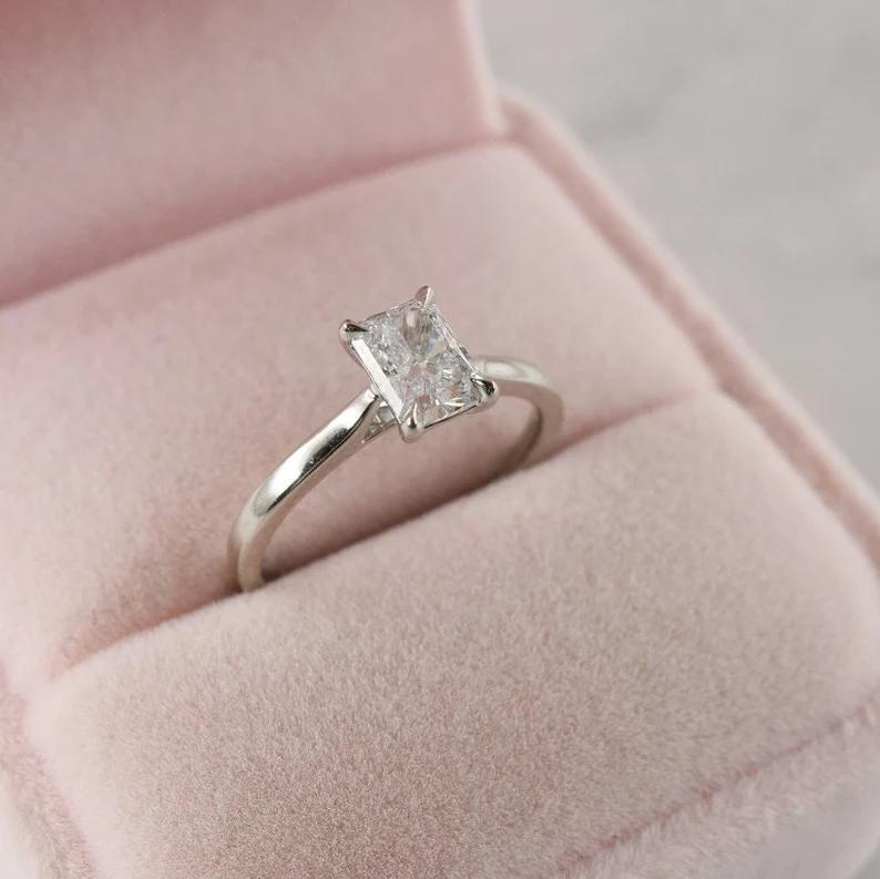 Radiant Cut Moissanite Engagement Ring, Thin 14k Gold Band, Minimalist Solitaire Wedding Ring, Art Deco Ring for Her, Dainty Promised Ring