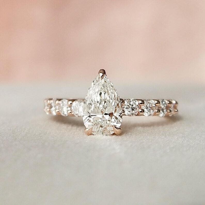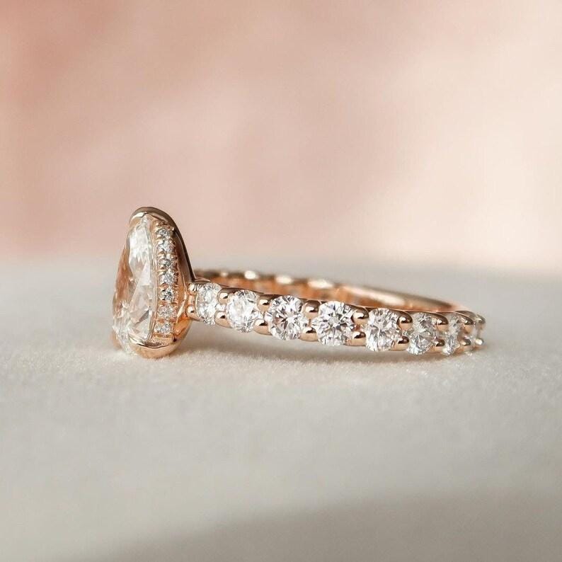 2 CT Pear Cut Moissanite Engagement Ring, Rose Gold Pear Shaped Wedding Ring, Tear Drop Diamond Anniversary Ring, Unique Bridal Set for Her