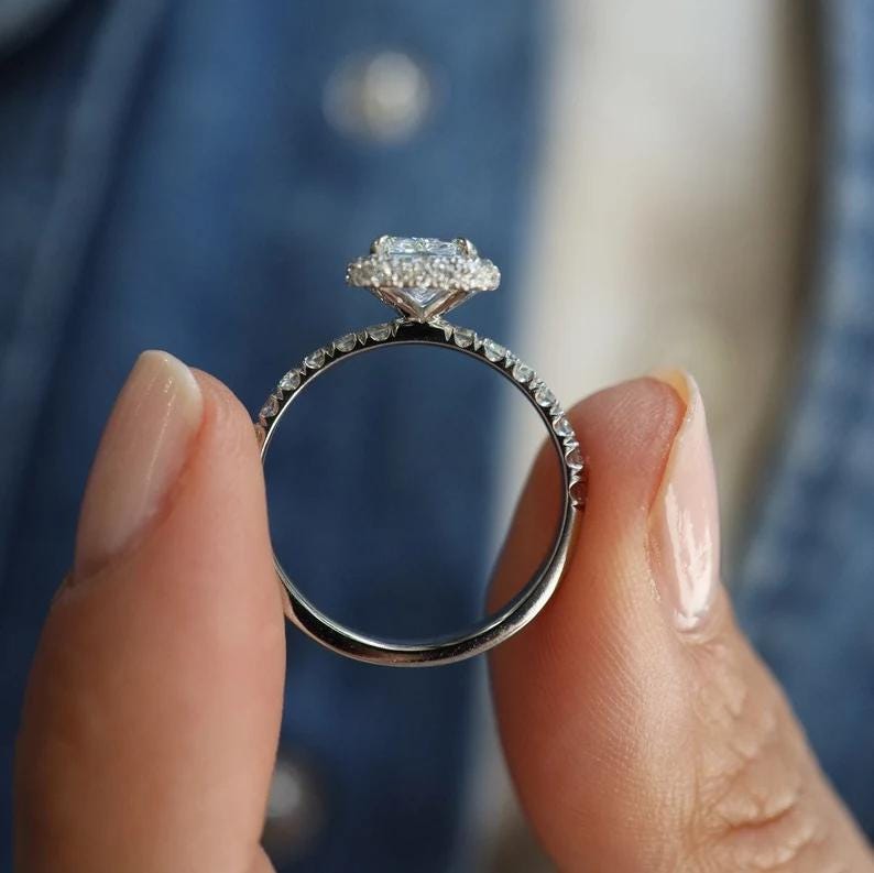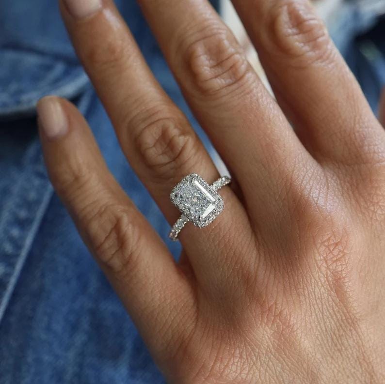 Radiant Cut Diamond Engagement Ring in 14K White Gold, Crushed Ice Radiant Moissanite Ring with Art Deco Halo Pave Band, Anniversary Gift