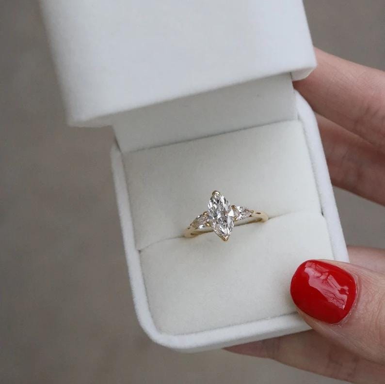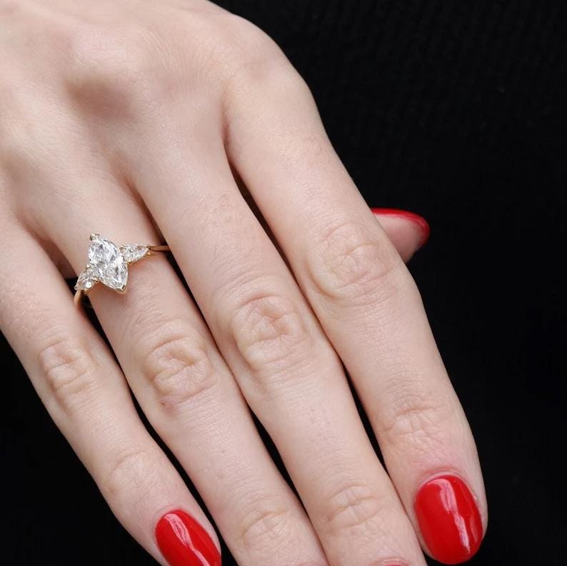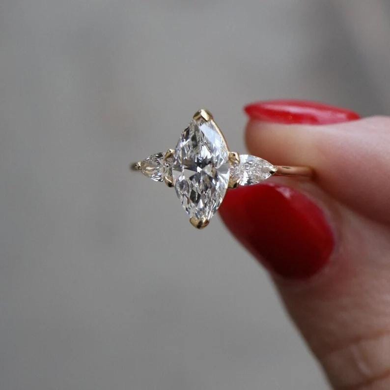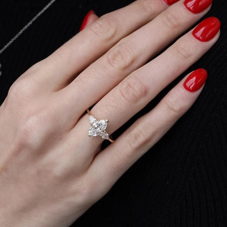 Marquise Diamond Engagement Ring in 14k Gold, Three Stone Marquise Ring, Pear Side Stones, Minimalist Bridal Set, Anniversary Gift for Her