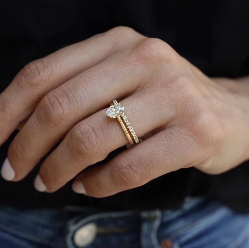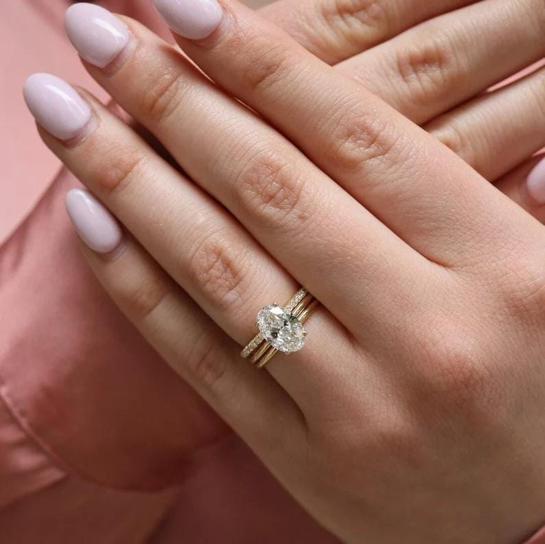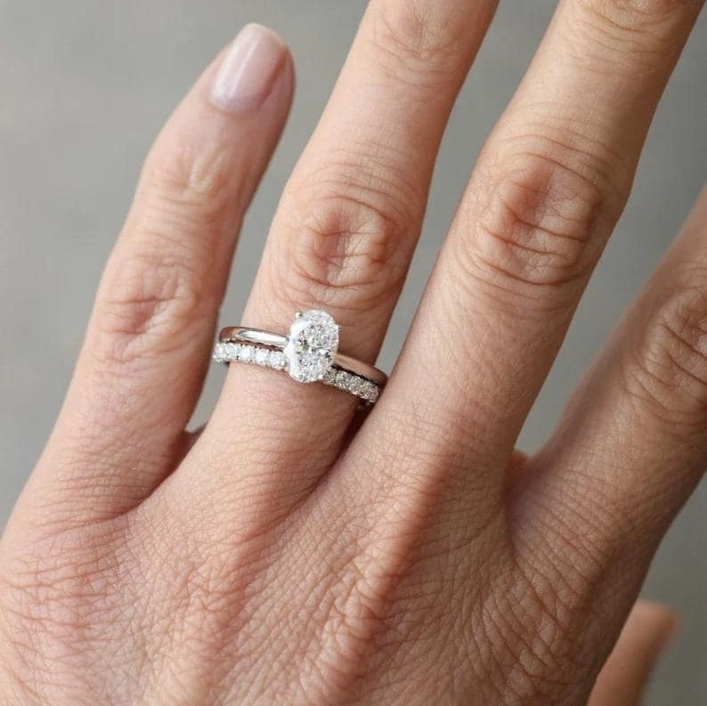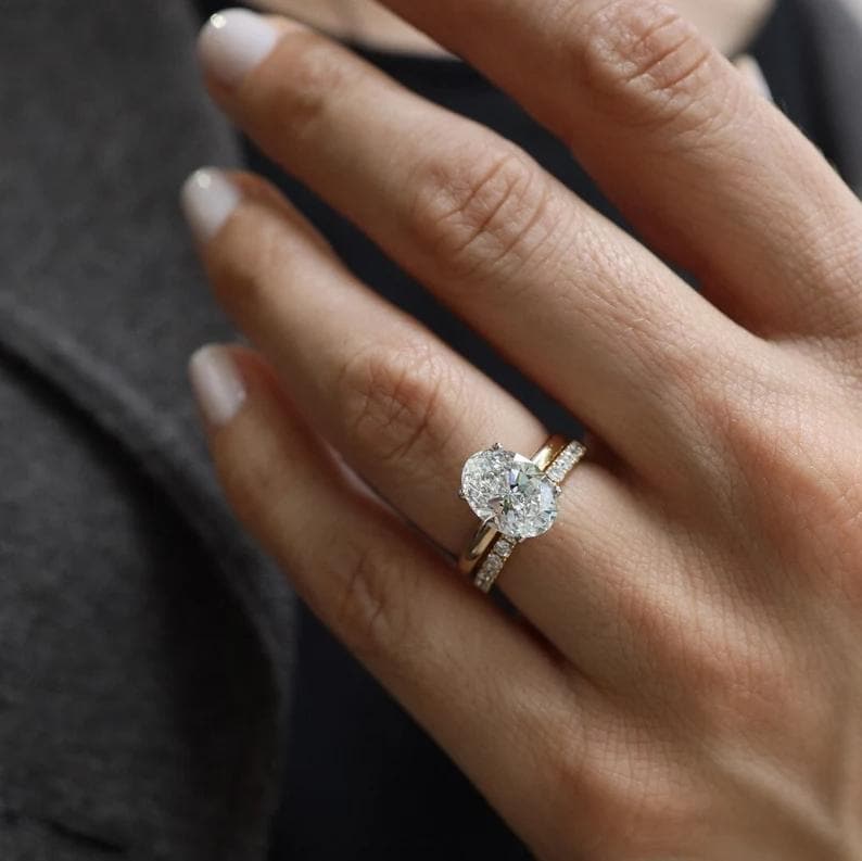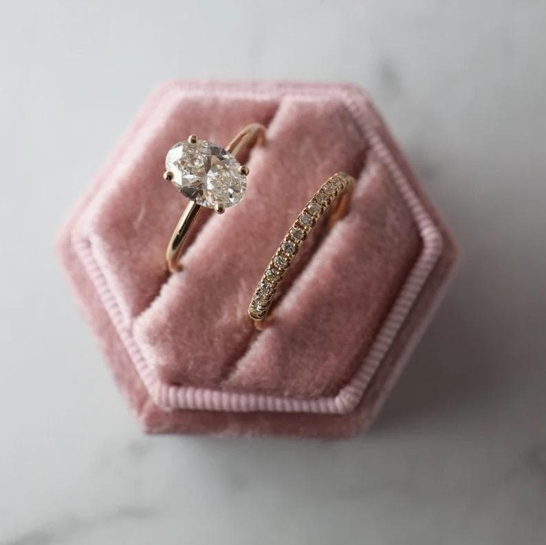 Oval Engagement Ring Set, 2 Carat Oval Diamond Ring with Hidden Halo, 14k Gold Pave Wedding Band, Solitaire Bridal Set for Her, Promise Ring