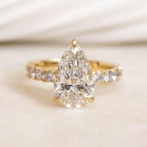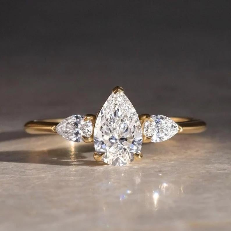 Pear Shaped Engagement Ring, Three Stone Diamond Ring, Pear Cut Moissanite Ring in 14k Gold, Pear with Side Stones, Unique Bridal Jewelry