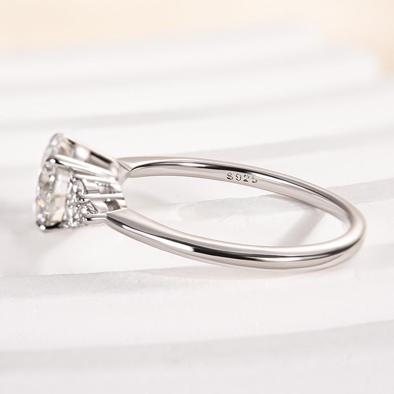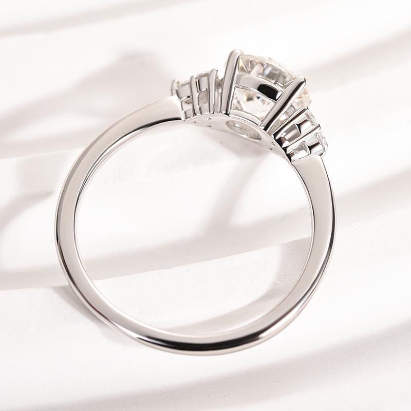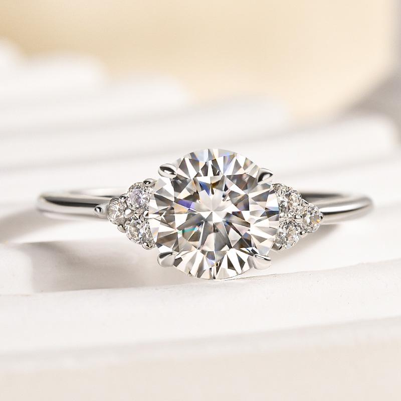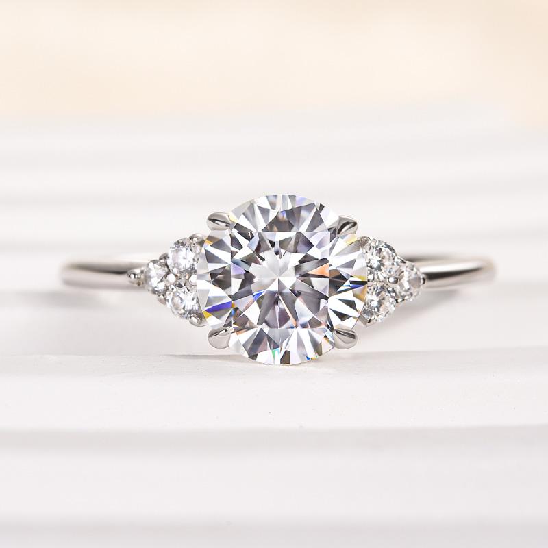 Round Moissanite Engagement Ring, 14k White Gold Cluster Ring, Brilliant Cut Solitaire with Side Stones, Art Deco Wedding Ring for Women